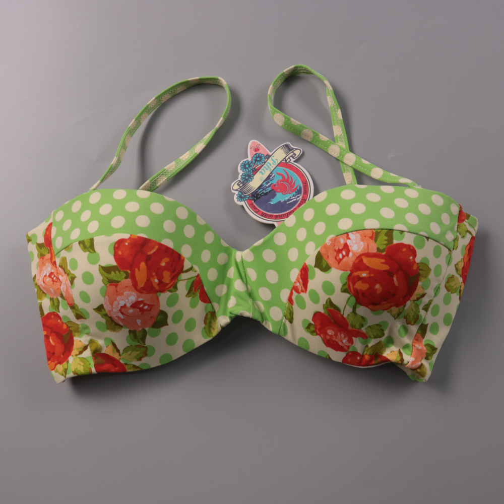 Женский верх от купальника-бандо с косточками и тонкими бретелями, принт в горошек и цветы. Подойдёт для пляжа и отдыха у бассейна, хорошо держит форму за счёт плотных чашек. Материал эластичный, быстро сохнет и комфортно садится по фигуре.