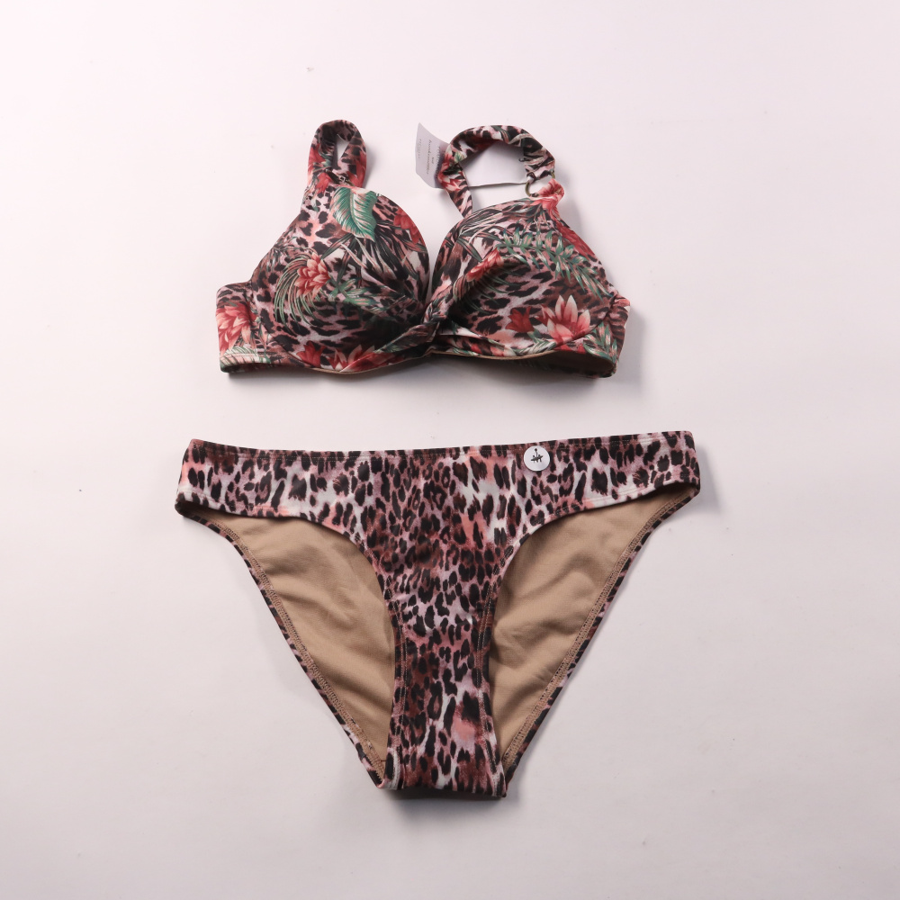 Раздельный купальник Hunkemöller с леопардовым принтом и цветочными вставками, верх с формованными чашками и широкими бретелями. Подойдёт для пляжа и бассейна, хорошо держит форму и сидит благодаря эластичному материалу.