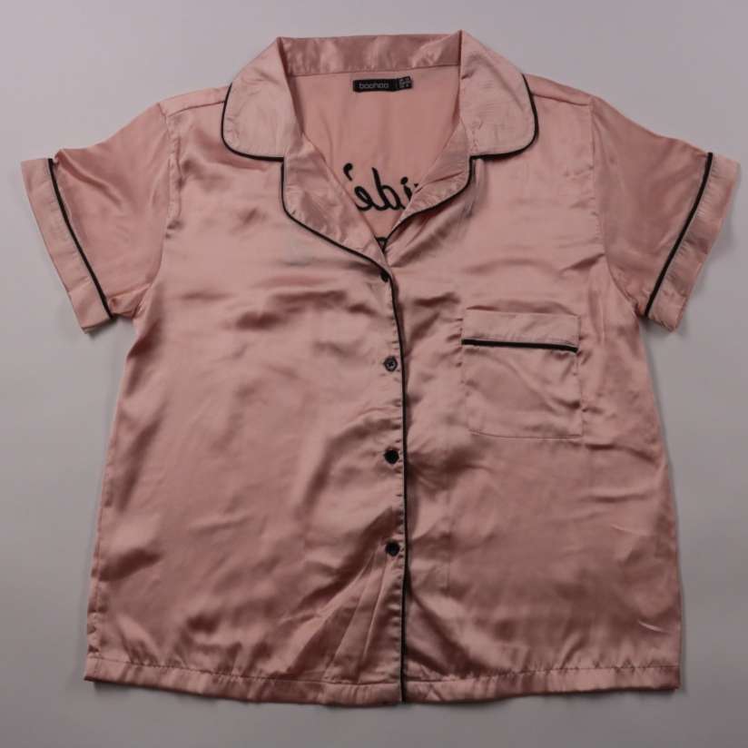 Женская сатиновая пижамная рубашка Boohoo нежно-розового цвета с чёрным кантом, коротким рукавом и нагрудным карманом. Подойдёт для сна и домашнего отдыха; на спине вышивка «Bride’s Squad». Лёгкая ткань быстро сохнет и комфортна в тёплом помещении.