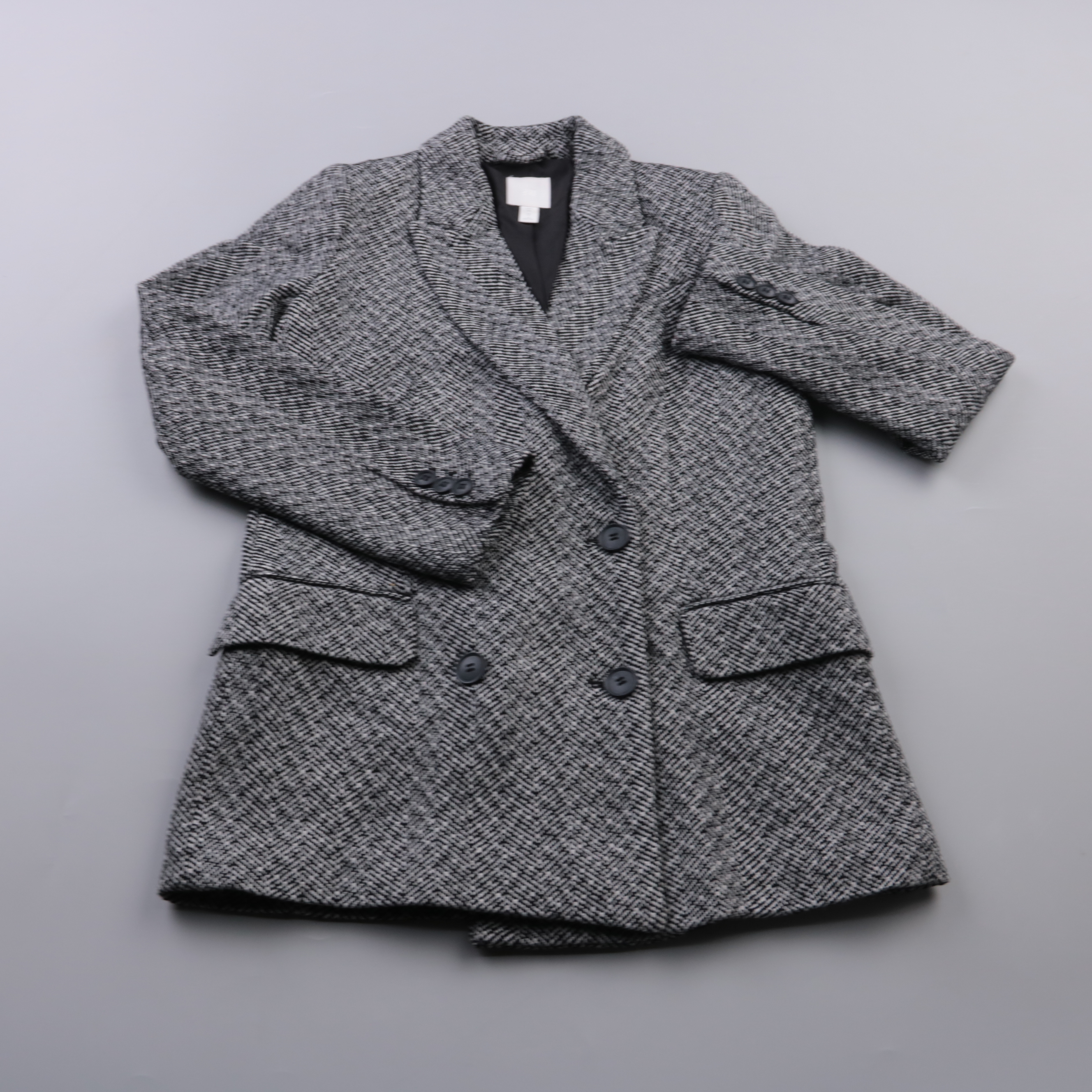 Женский двубортный пиджак H&M из твидовой ткани в сером цвете с отложным воротником и клапанами карманов. Подойдёт для офиса и повседневных образов в прохладную погоду, хорошо сочетается с джинсами и классическими брюками. Плотная ткань и подкладка пом...