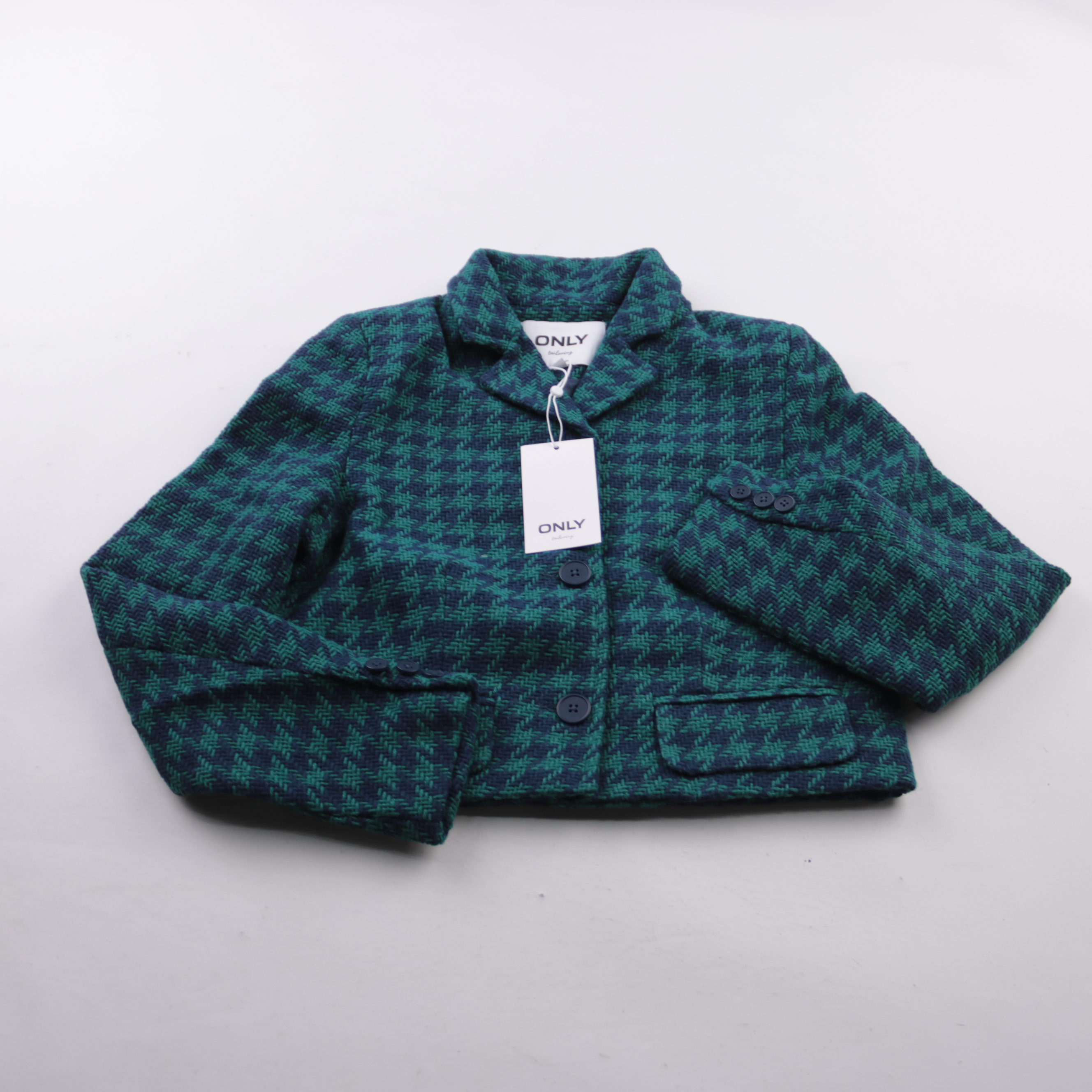 Укороченный женский пиджак Only из букле с узором «гусиная лапка» в сине‑зелёной гамме. Подойдёт для офиса и повседневных образов в прохладную погоду, хорошо сочетается с джинсами и брюками. Плотная ткань держит форму и выглядит аккуратно.