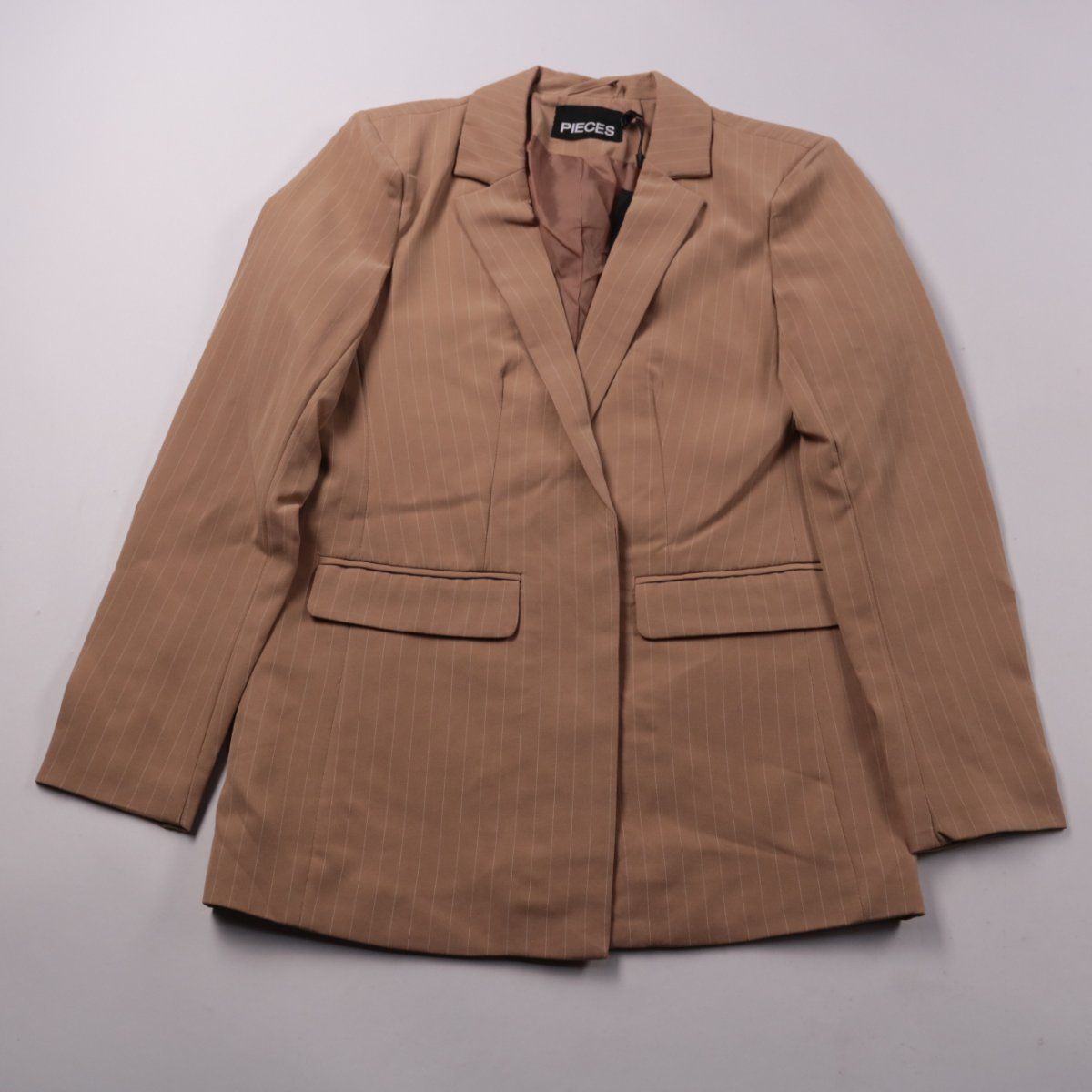 Женский пиджак Pieces бежевого цвета в тонкую полоску, классический крой с лацканами и карманами с клапанами. Подойдёт для офиса и повседневных образов, легко сочетается с брюками, джинсами и юбками. Практичный плюс — полностью на подкладке, поэтому удобнее надевать поверх топов и блуз.