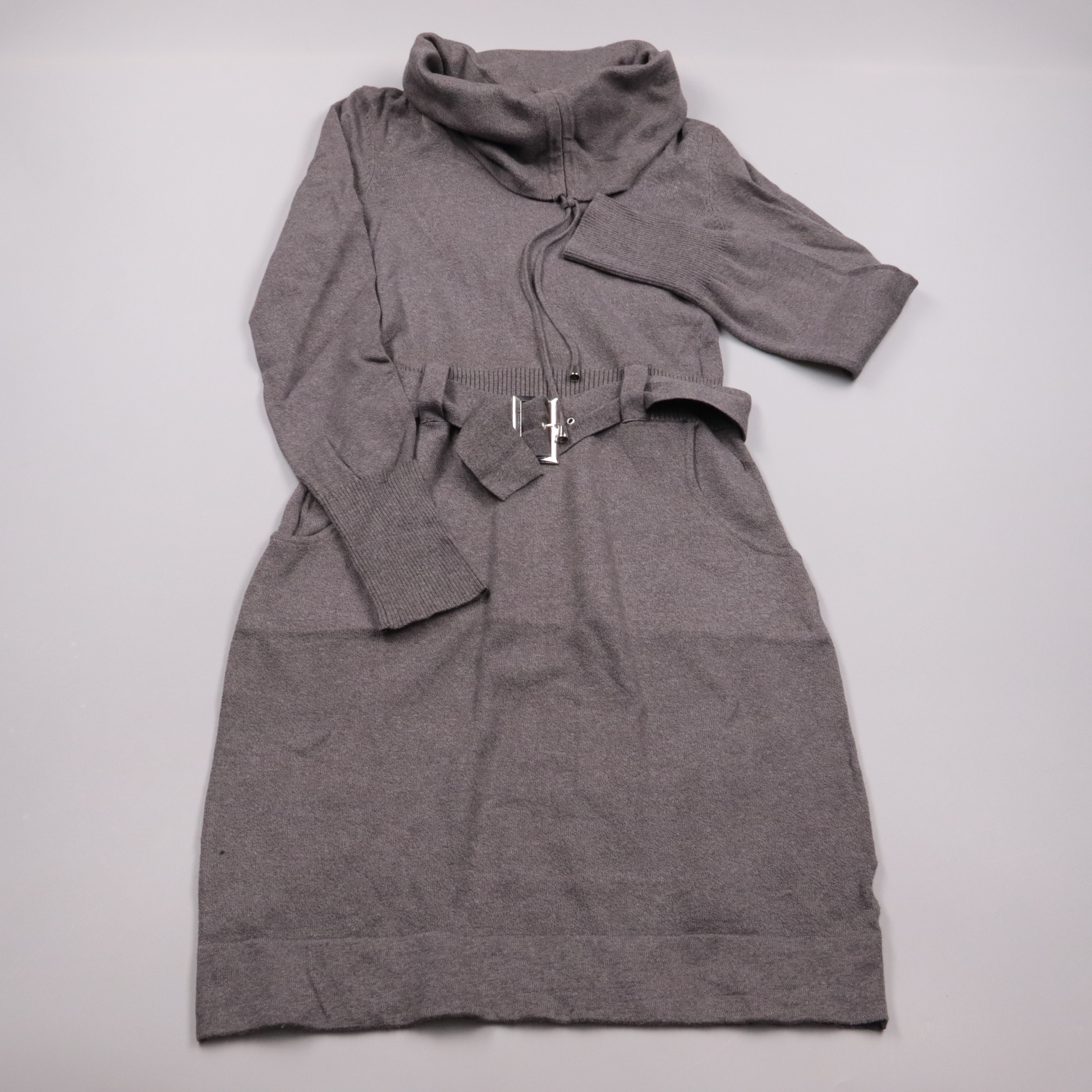 Вязаное платье B.C. (Best Connections) серого цвета с высоким воротом-хомутом и длинным рукавом. Модель с карманами и поясом с пряжкой хорошо подходит для повседневных образов в прохладную погоду. Трикотаж тянется и комфортно садится по фигуре, пояс по...