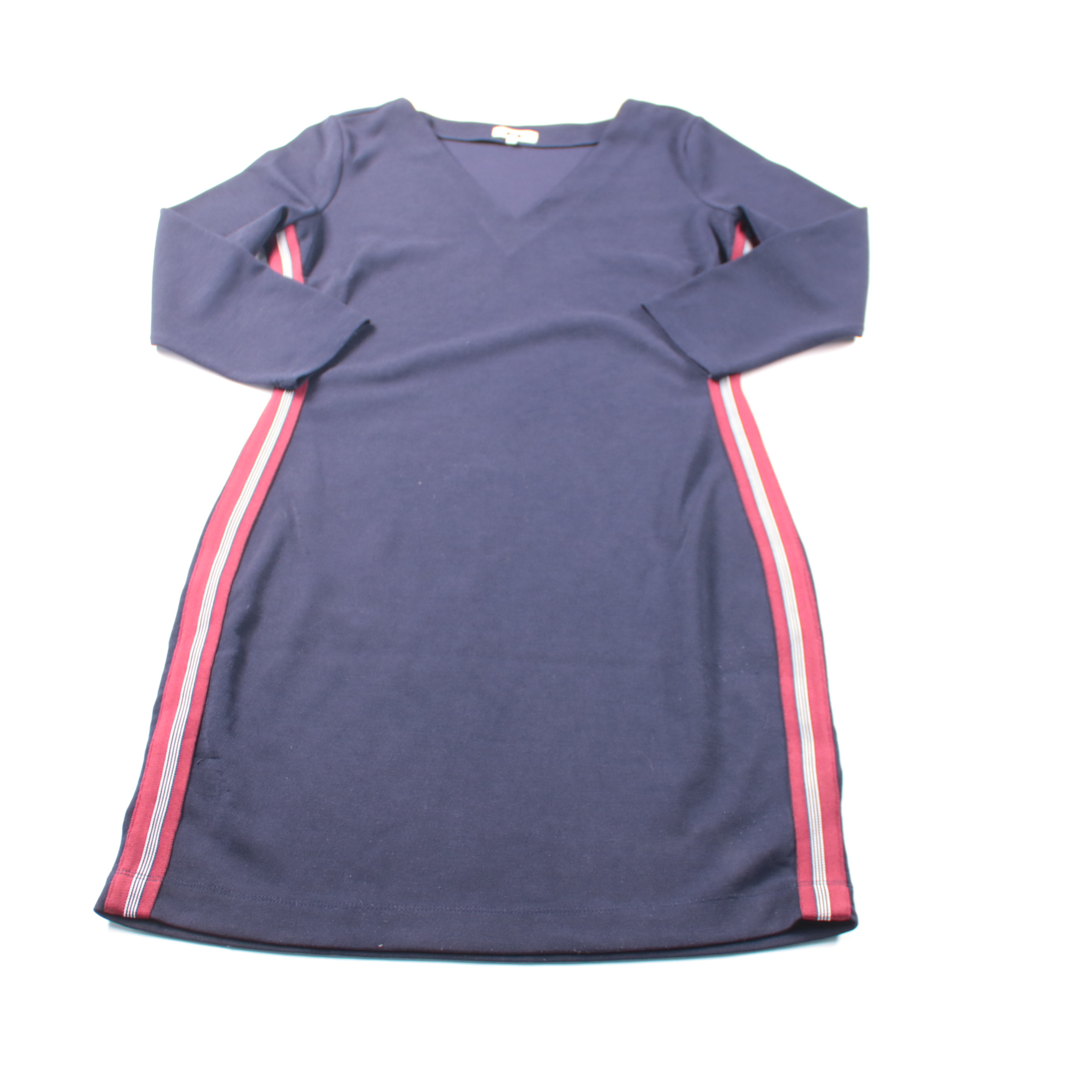 Повседневное платье We тёмно-синего цвета с V‑образным вырезом и длинным рукавом, по бокам контрастные полосы. Подойдёт для офиса и на каждый день, хорошо сочетается с кедами или ботильонами. Эластичная ткань комфортно тянется и не сковывает движения.