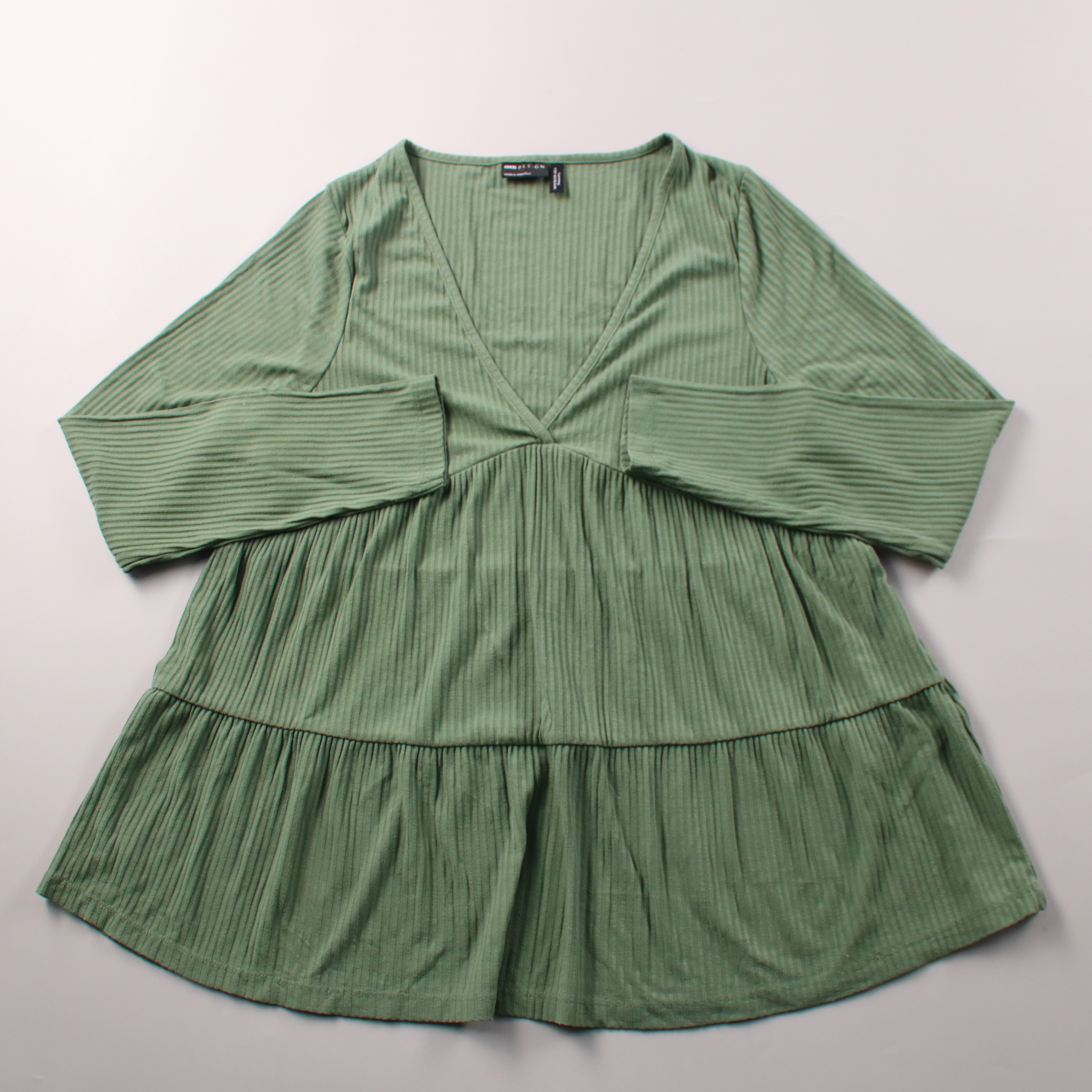 Повседневное платье ASOS DESIGN в зеленом цвете из мягкой ткани в рубчик, с V‑образным вырезом и длинными рукавами. Свободный ярусный крой подойдет для прогулок и повседневных образов, легко сочетается с кедами или ботинками. Практично тем, что не стес...