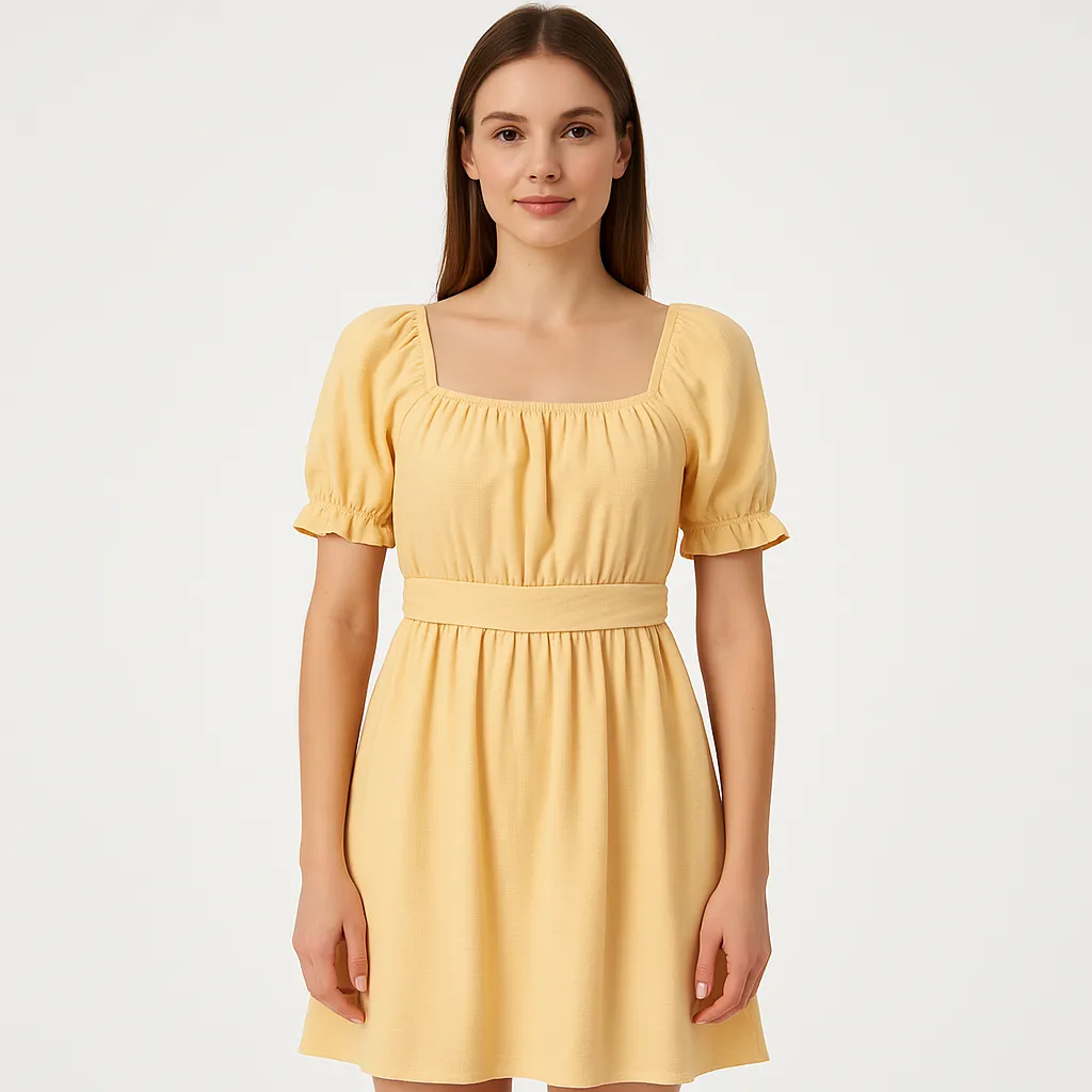 Женское повседневное платье с квадратным вырезом и рукавами-фонариками в нежно-жёлтом оттенке. Подойдёт для прогулок и отдыха в тёплую погоду, благодаря свободной юбке и мягкой посадке по талии. Лёгкая ткань хорошо проветривается и комфортна в носке.