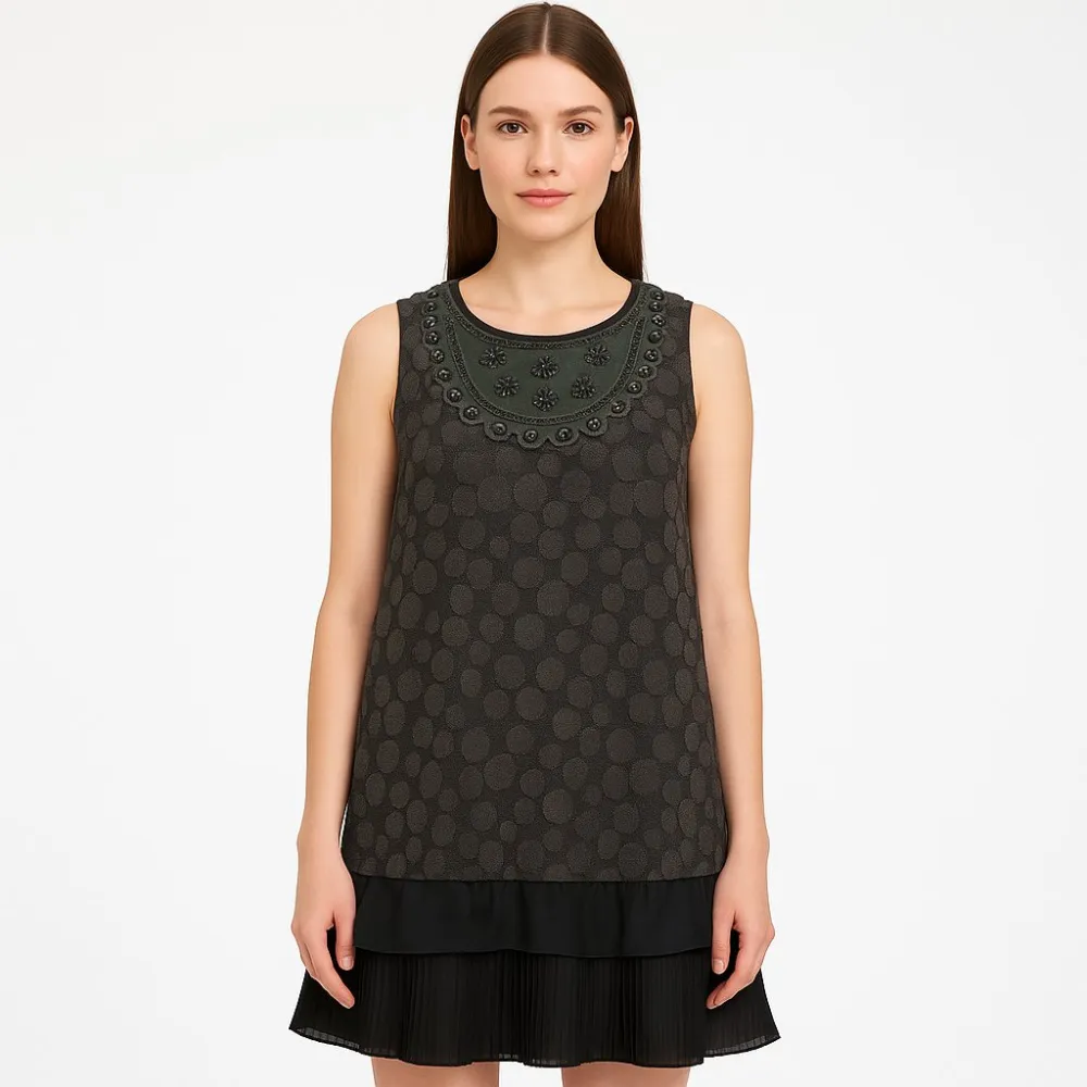 Повседневное платье Cutie без рукавов, с фактурным узором в горох и декоративной отделкой по линии горловины. Подойдёт для офиса и прогулок, легко сочетается с жакетом или кардиганом. Материал практичный и почти не мнётся, юбка с плиссированной вставко...