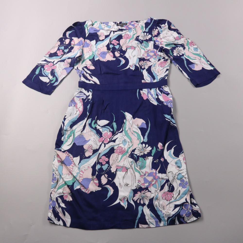 Повседневное платье Warehouse с цветочным принтом на тёмно-синем фоне и рукавом 3/4. Подойдёт для города и офиса в тёплый сезон, хорошо смотрится с балетками или босоножками. Вискоза лёгкая и приятная к телу, поясная линия аккуратно подчёркивает силуэт.