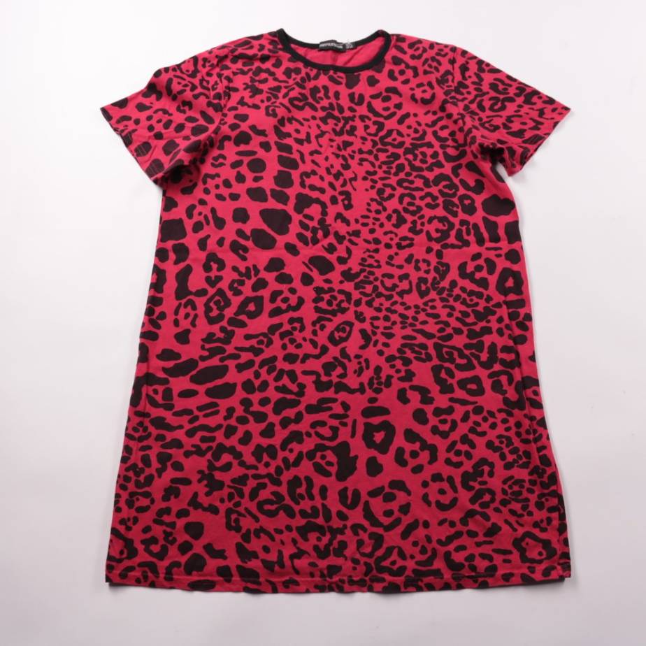 Повседневное платье-футболка PrettyLittleThing с коротким рукавом и леопардовым принтом в красно-чёрной гамме. Подойдёт для прогулок и повседневных образов с кедами или сандалиями. Натуральный хлопок приятен к телу и легко стирается.