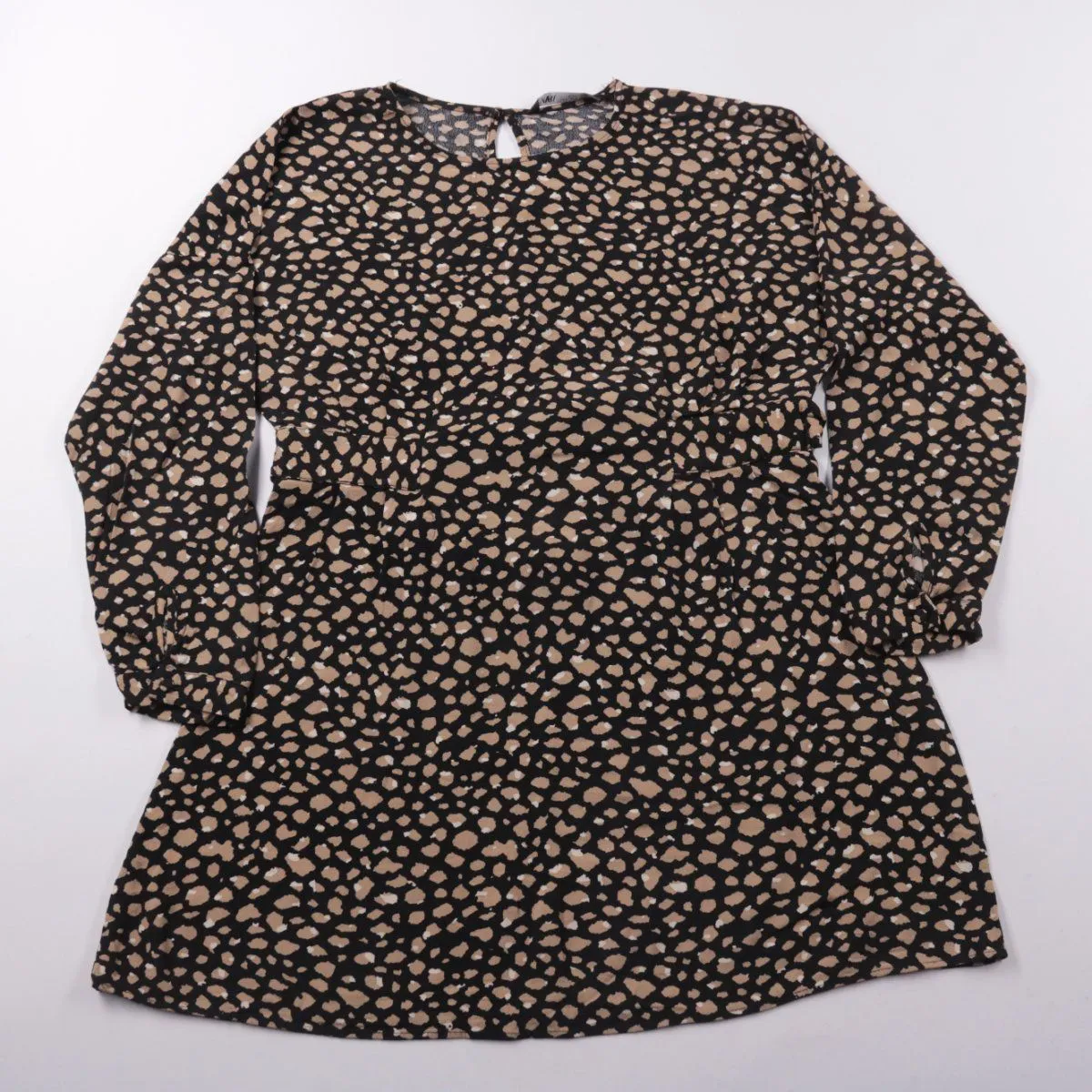 Женское повседневное платье Zara с длинными рукавами и принтом на чёрном фоне. Подойдёт для офиса и прогулок в прохладную погоду, хорошо смотрится с ботинками или лоферами. Практичный плюс — немаркий цвет и комфортная посадка за счёт свободного кроя.