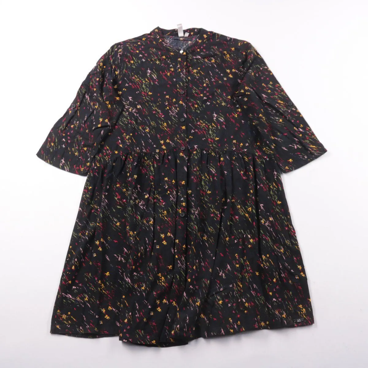 Повседневное платье-рубашка Q/S с абстрактным разноцветным принтом на чёрном фоне и свободной посадкой. Подойдёт для офиса и прогулок, можно носить с ботинками или кедами. Вискоза приятна к телу и хорошо дышит.