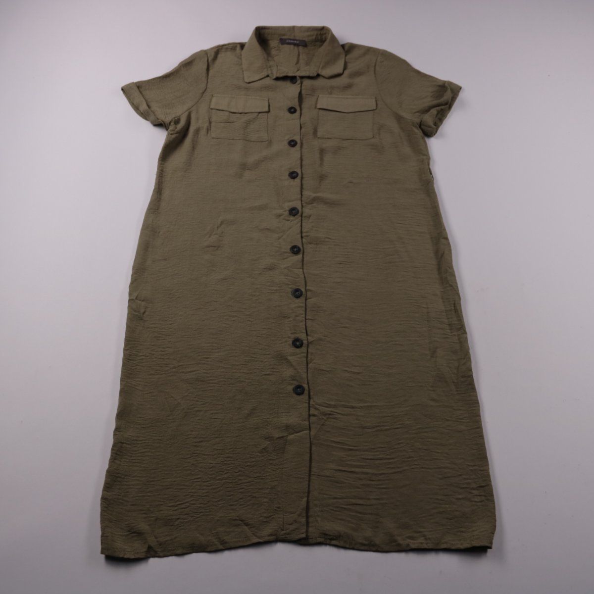 Повседневное платье-рубашка Primark цвета хаки с коротким рукавом и застёжкой на пуговицы по всей длине, с нагрудными карманами. Подойдёт для прогулок и поездок в тёплую погоду, удобно носить как самостоятельно, так и поверх топа/шорт. Практичный плюс — можно регулировать посадку и разрез снизу, расстёгивая пуговицы.