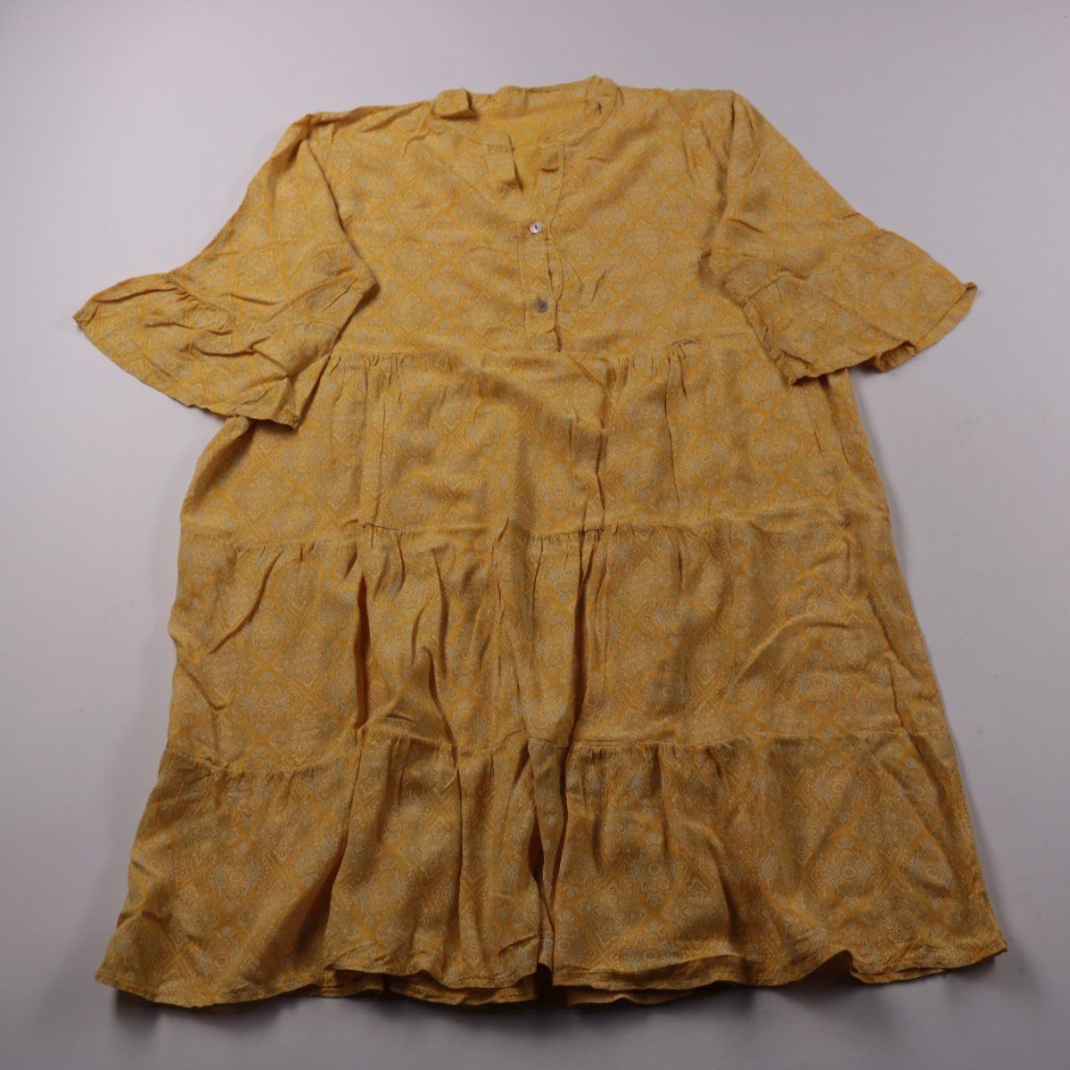 Женское повседневное платье свободного кроя с ярусной юбкой и короткой планкой на пуговицах. Подойдёт для лета и отдыха благодаря лёгкой ткани и ненавязчивому узору. Удобно тем, что не сковывает движения и легко сочетается с сандалиями или кедами.