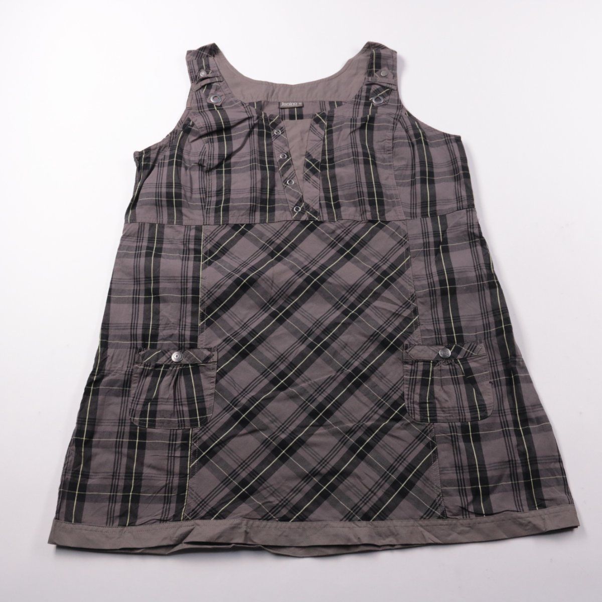 Повседневное платье-сарафан Janina в клетку, без рукавов, с декоративной планкой на пуговицах и накладными карманами. Подойдёт для носки с водолазкой или лонгсливом в прохладную погоду и для повседневных образов. Натуральный хлопок в составе верха хорошо дышит и комфортен в течение дня.