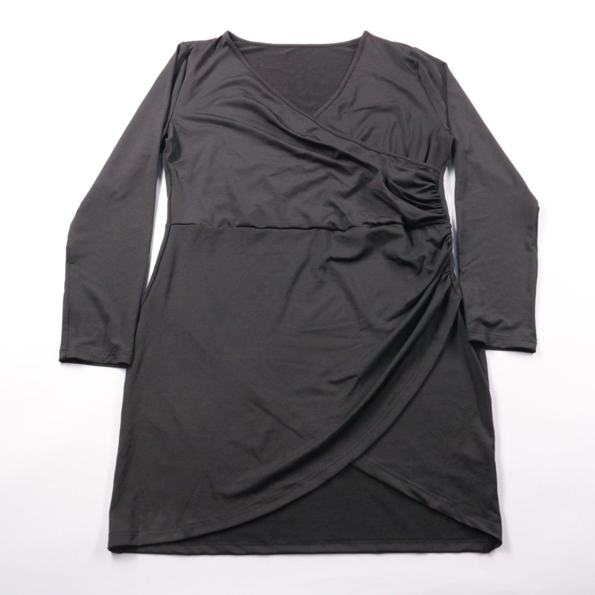 Женское повседневное платье с запахом и V-образным вырезом, длинный рукав. Подойдёт для офиса и на каждый день, за счёт драпировки хорошо садится по фигуре. Практичный полиэстер почти не мнётся и быстро сохнет после стирки.