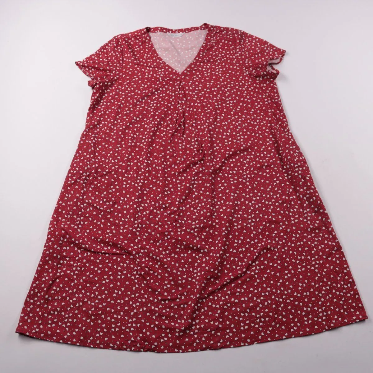 Женское повседневное платье свободного кроя с V-образным вырезом и коротким рукавом. Подойдёт для прогулок и на каждый день в тёплую погоду, принт с белыми сердечками делает образ более мягким. Лёгкая ткань комфортна в носке и не стесняет движений.