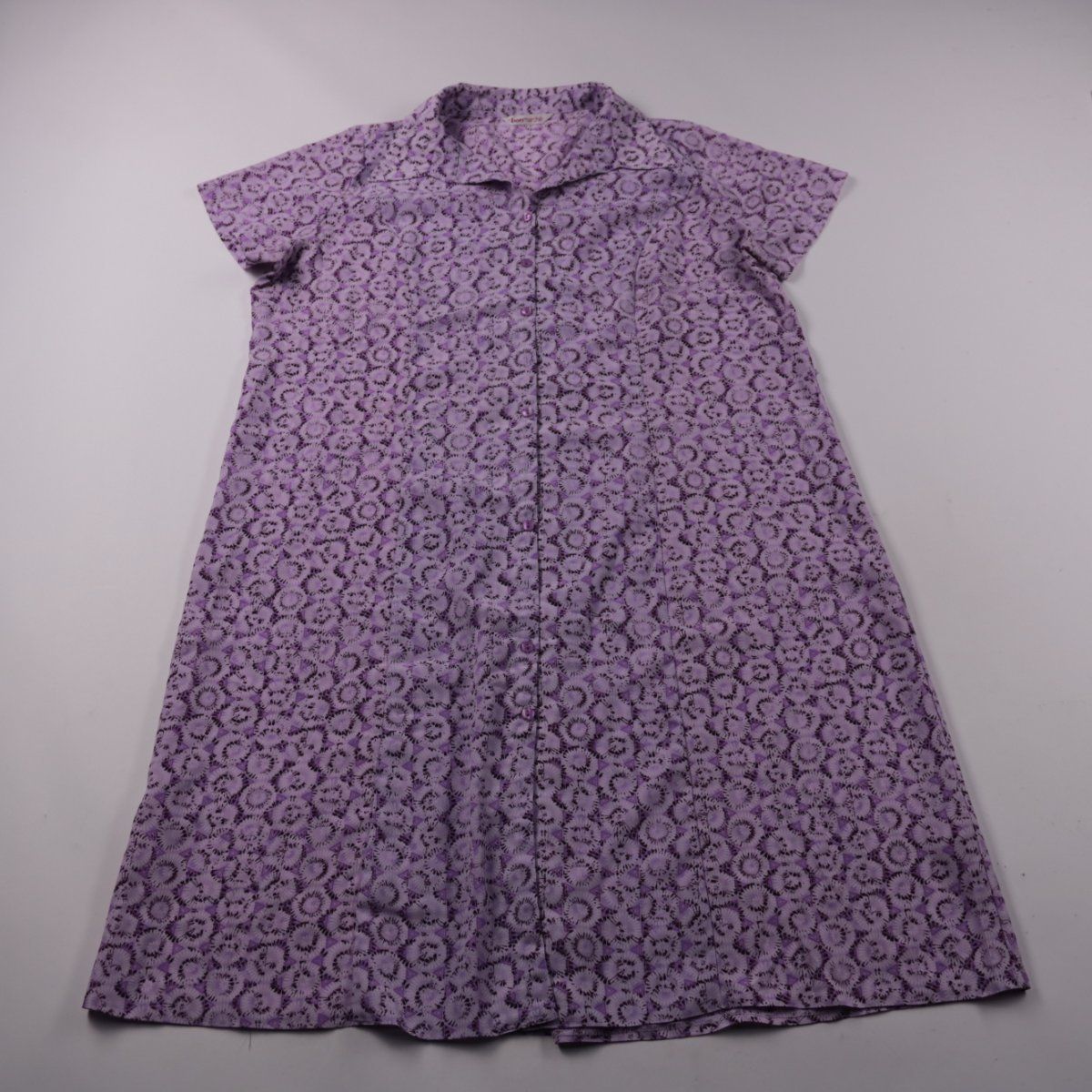 Повседневное платье-рубашка Bonmarché лилово-фиолетового цвета с мелким чёрным принтом, с воротником и застёжкой на пуговицы по всей длине. Подойдёт для лета и тёплой погоды, на каждый день или в офис в спокойном стиле. Практичный плюс — ткань из полиэстера проста в уходе и меньше мнётся.