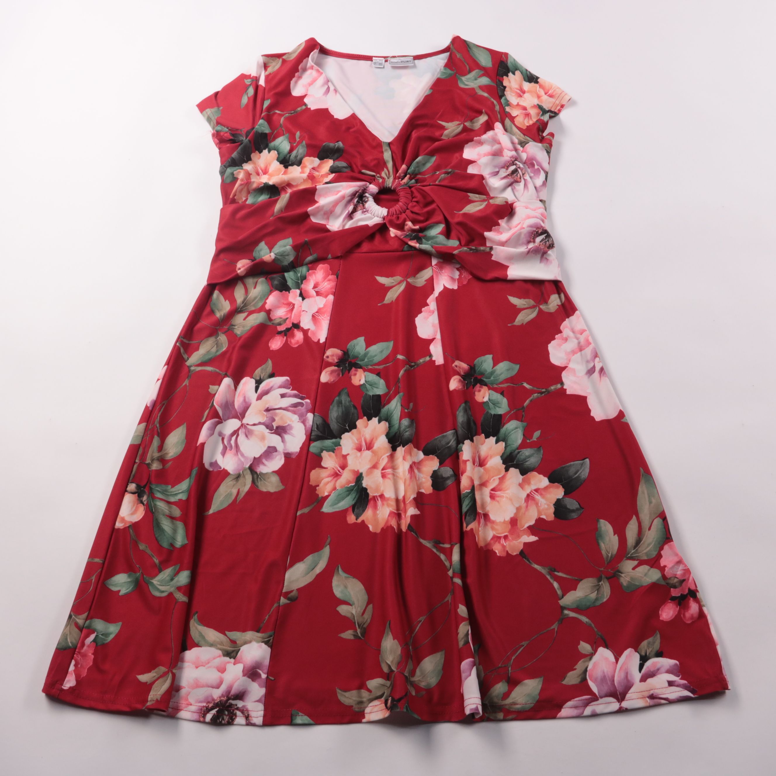 Повседневное платье Bodyflirt красного цвета с крупным цветочным принтом, V-образным вырезом и короткими рукавами. Спереди драпировка с декоративным сбором на талии, подойдёт для прогулок и летних встреч. Эластичная ткань комфортно тянется и хорошо сад...