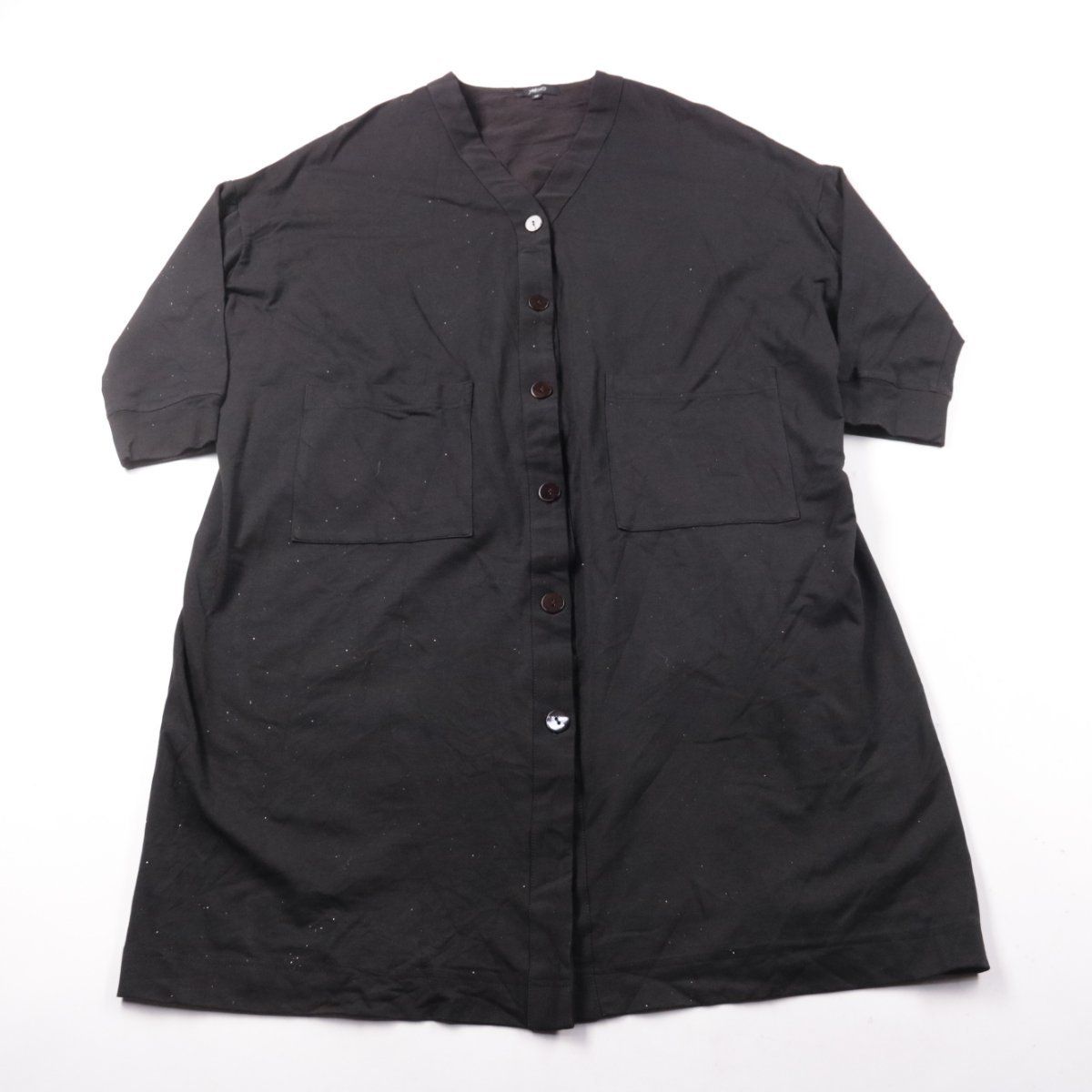 Повседневное платье-рубашка Motto чёрного цвета с V-образным вырезом и застёжкой на пуговицы. Подойдёт для города и офиса летом или как слой в демисезон, есть два накладных кармана спереди. Практичное преимущество — удобный прямой крой и несложный уход за тканью.