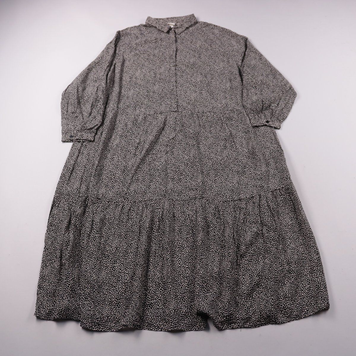 Повседневное платье H&M из 100% вискозы с мелким чёрно-белым принтом, воротником и планкой на пуговицах. Свободный крой с ярусной юбкой подойдёт для прогулок и повседневных образов в городе. Вискоза хорошо дышит и комфортна в носке.