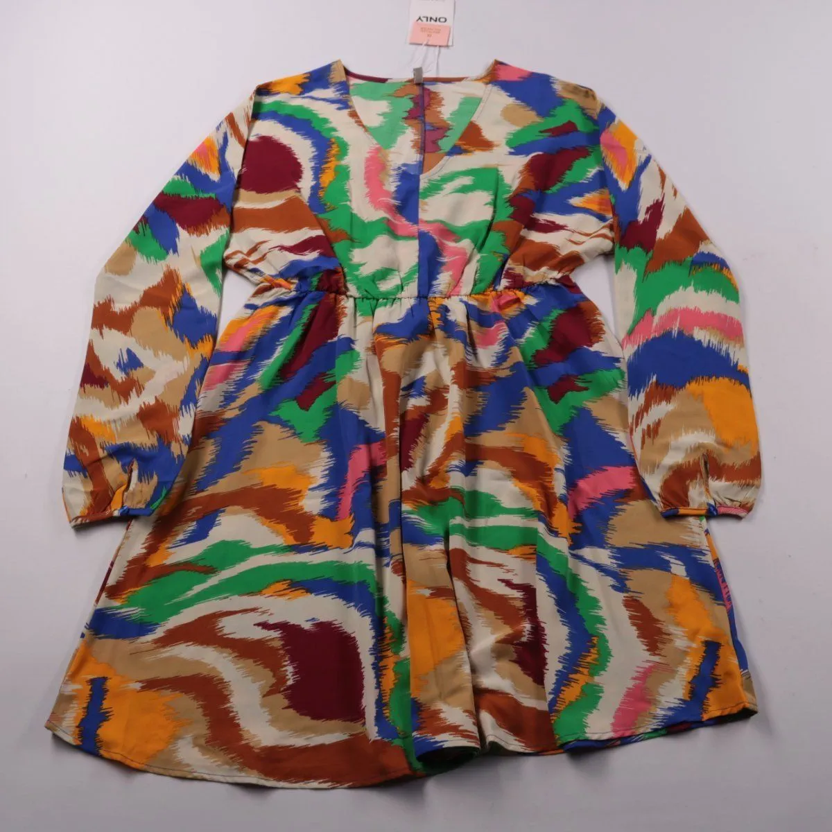 Платье ONLY с V-образным вырезом, длинными рукавами и ярким абстрактным принтом. Подойдёт для повседневных образов в городе весной и прохладным летом благодаря лёгкой ткани и эластичной талии. Практично тем, что почти не мнётся и быстро сохнет.