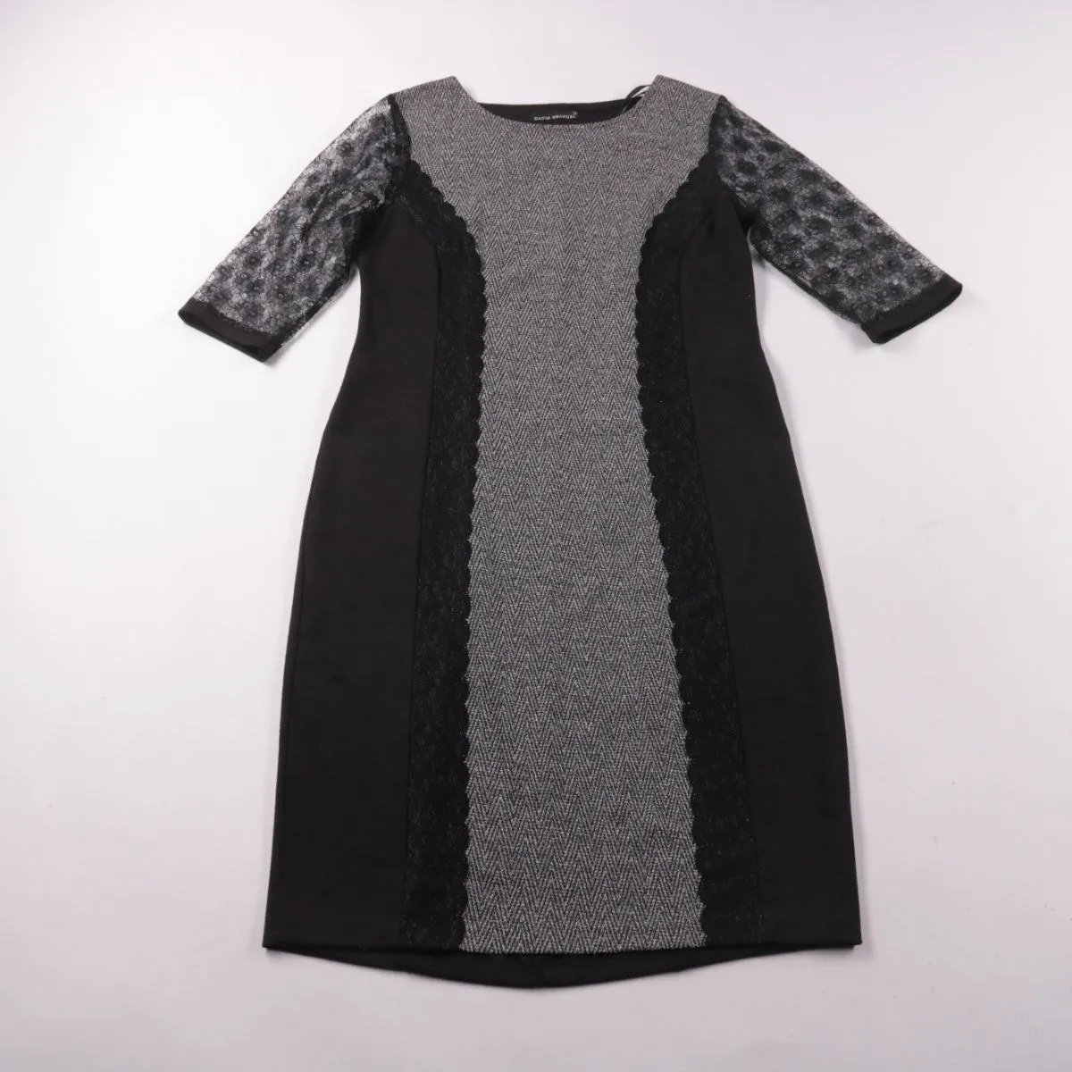 Повседневное платье David Emanuel прямого силуэта с контрастной серой вставкой «ёлочка» и кружевными рукавами. Подойдёт для офиса и городских образов, хорошо сочетается с жакетом и классической обувью. Практичный плюс — плотная ткань со стрейчем комфортно садится по фигуре.