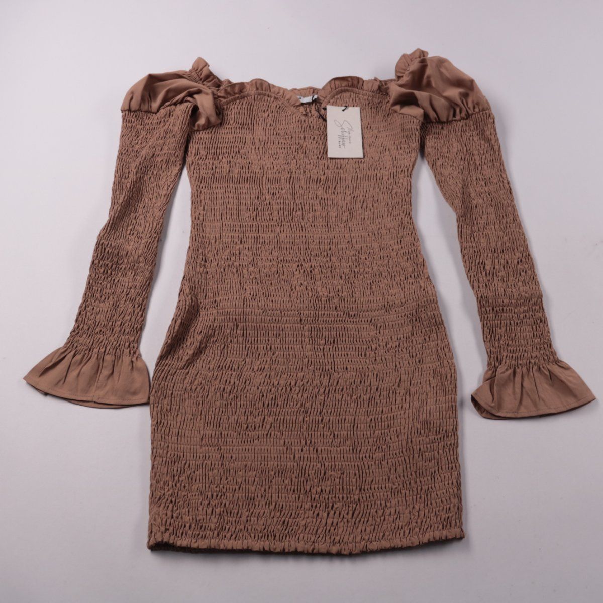 Повседневное платье NA-KD коричневого оттенка с жатой (smocked) фактурой и открытой линией плеч. Длинные рукава с воланами делают модель подходящей для прогулок и неформальных выходов. Эластичный материал хорошо садится по фигуре и комфортно тянется.