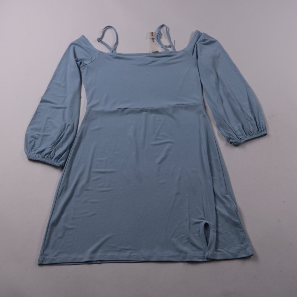 Повседневное платье NA-KD x Pamela в голубом цвете с квадратным вырезом и тонкими бретелями. Модель с длинными объёмными рукавами на резинке и завышенной линией талии подойдёт для прогулок и повседневных образов. Трикотажная ткань с эластаном слегка тянется и комфортно садится по фигуре.