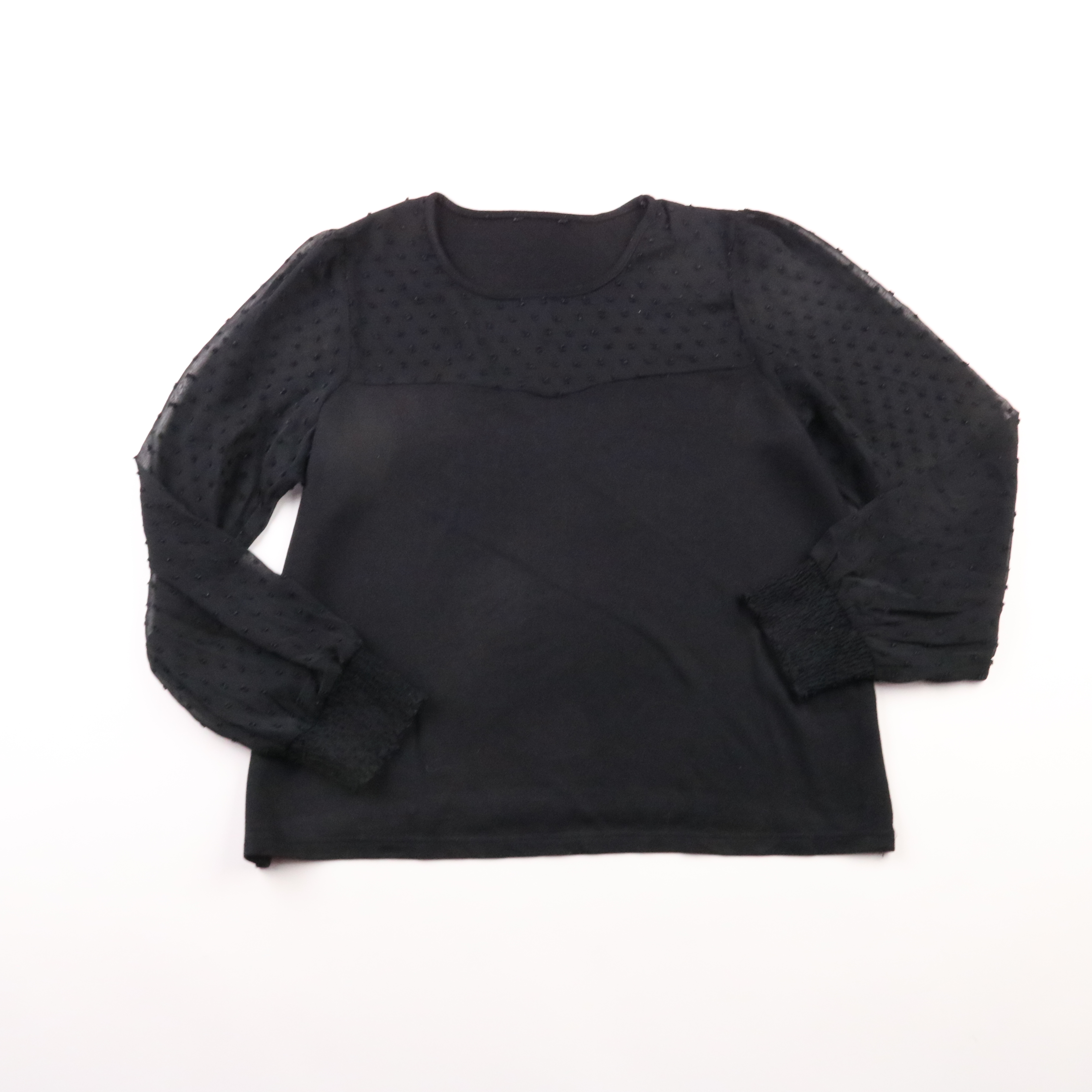 Чёрная блузка с полупрозрачными рукавами в фактурный горошек и мягкими манжетами. Подойдёт для офиса, встреч и вечерних образов благодаря лаконичному крою и аккуратной горловине. Ткань приятная к телу и немного тянется, поэтому удобно сидит и не сковыв...