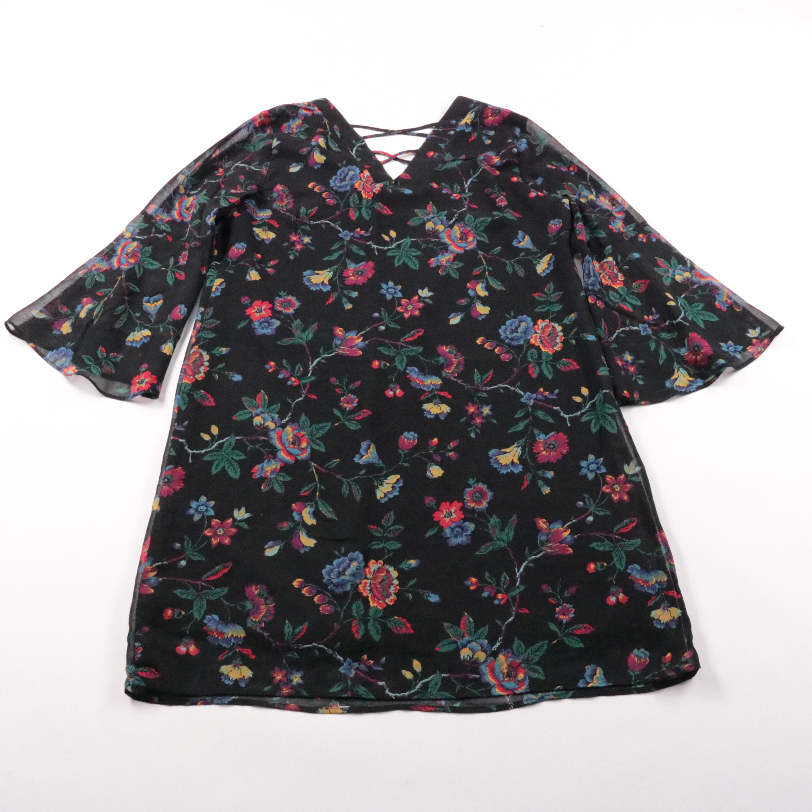 Женская блузка George на чёрной основе с ярким цветочным принтом и V-образным вырезом со шнуровкой. Подойдёт для повседневных образов и офиса с жакетом в тёплое время года. Лёгкая ткань и свободный крой не сковывают движения.