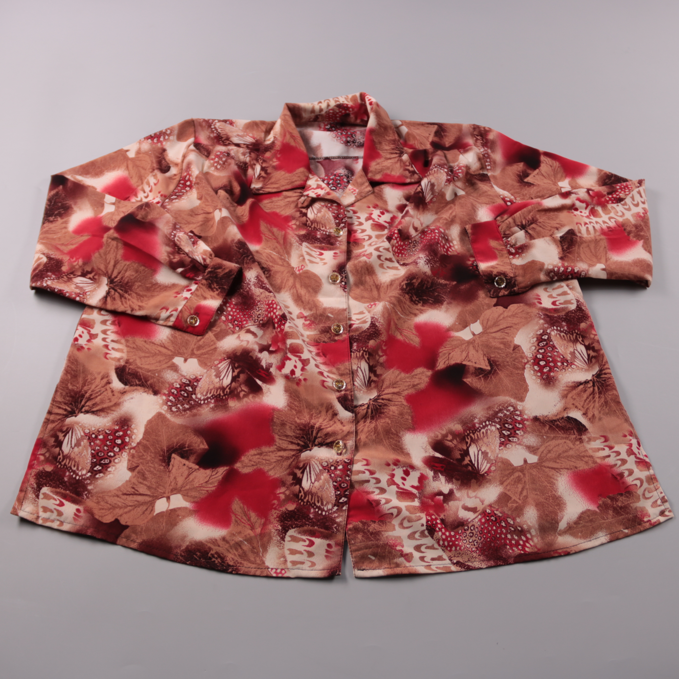 Женская блузка с длинным рукавом и отложным воротником, выполнена в ярком абстрактно-цветочном принте в красно-коричневой гамме. Подойдёт для повседневных образов и офиса в стиле casual, хорошо сочетается с однотонными брюками или джинсами. Практичный ...