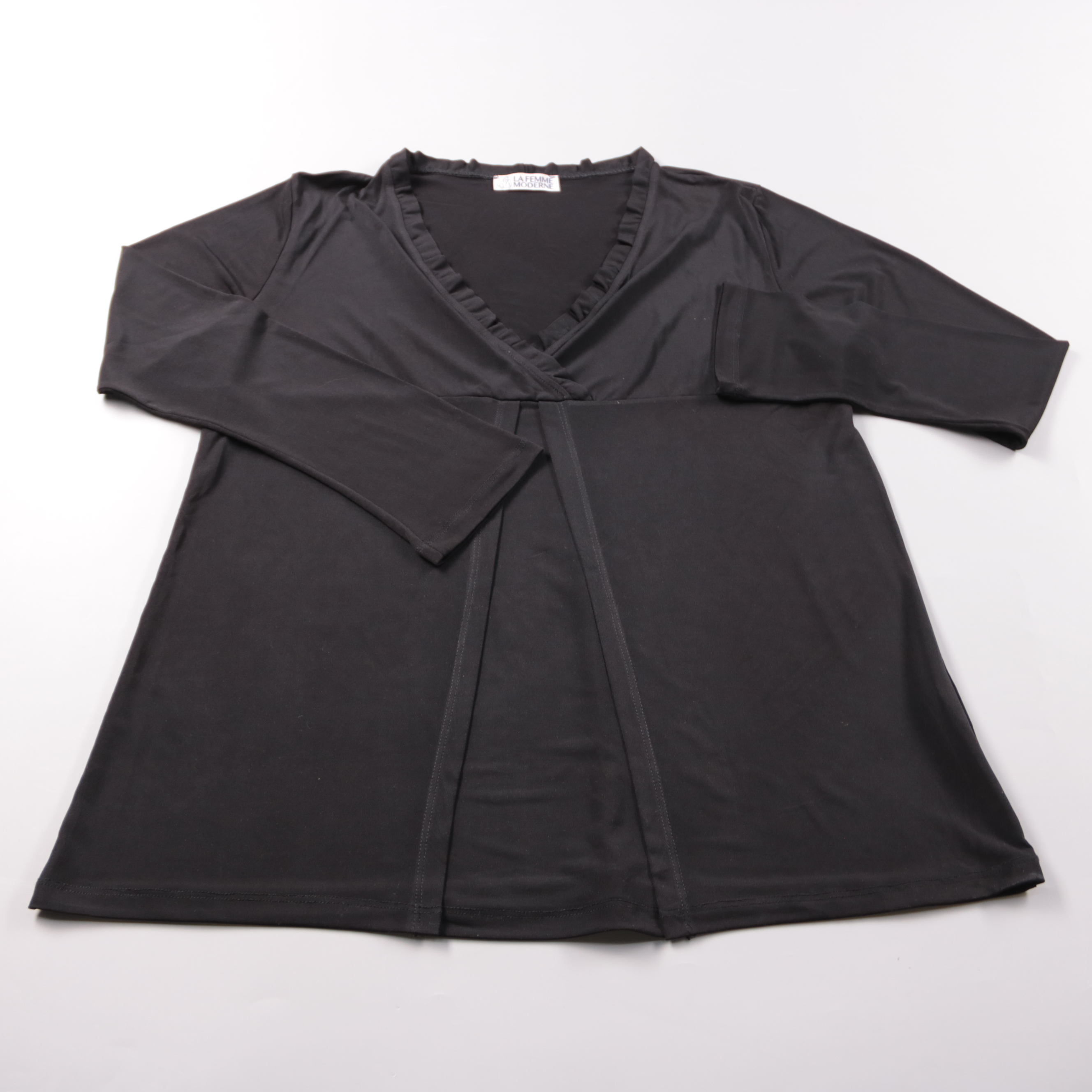 Женская блузка La Femme Moderne чёрного цвета с V-образным вырезом и декоративной отделкой по горловине. Подойдёт для офиса и повседневных образов, хорошо сочетается с брюками и юбками. Практичный плюс — эластичная ткань почти не мнётся и комфортно сад...