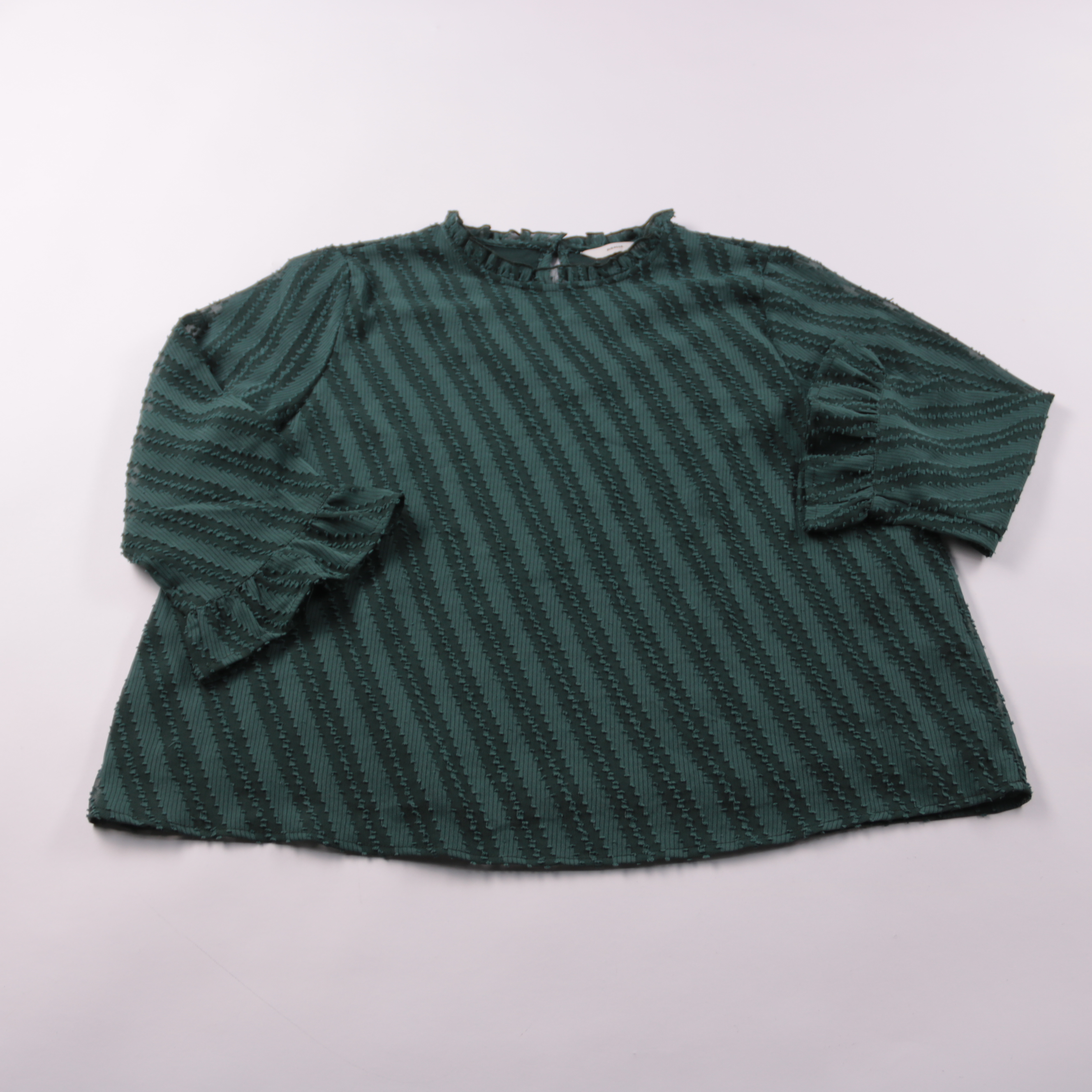 Блузка PIGALLE тёмно-зелёного цвета с фактурной полоской и декоративными оборками на рукавах и горловине. Подойдёт для офиса и повседневных образов с брюками или юбкой, когда хочется добавить акцент без ярких принтов. Материал 100% полиэстер — ткань ме...
