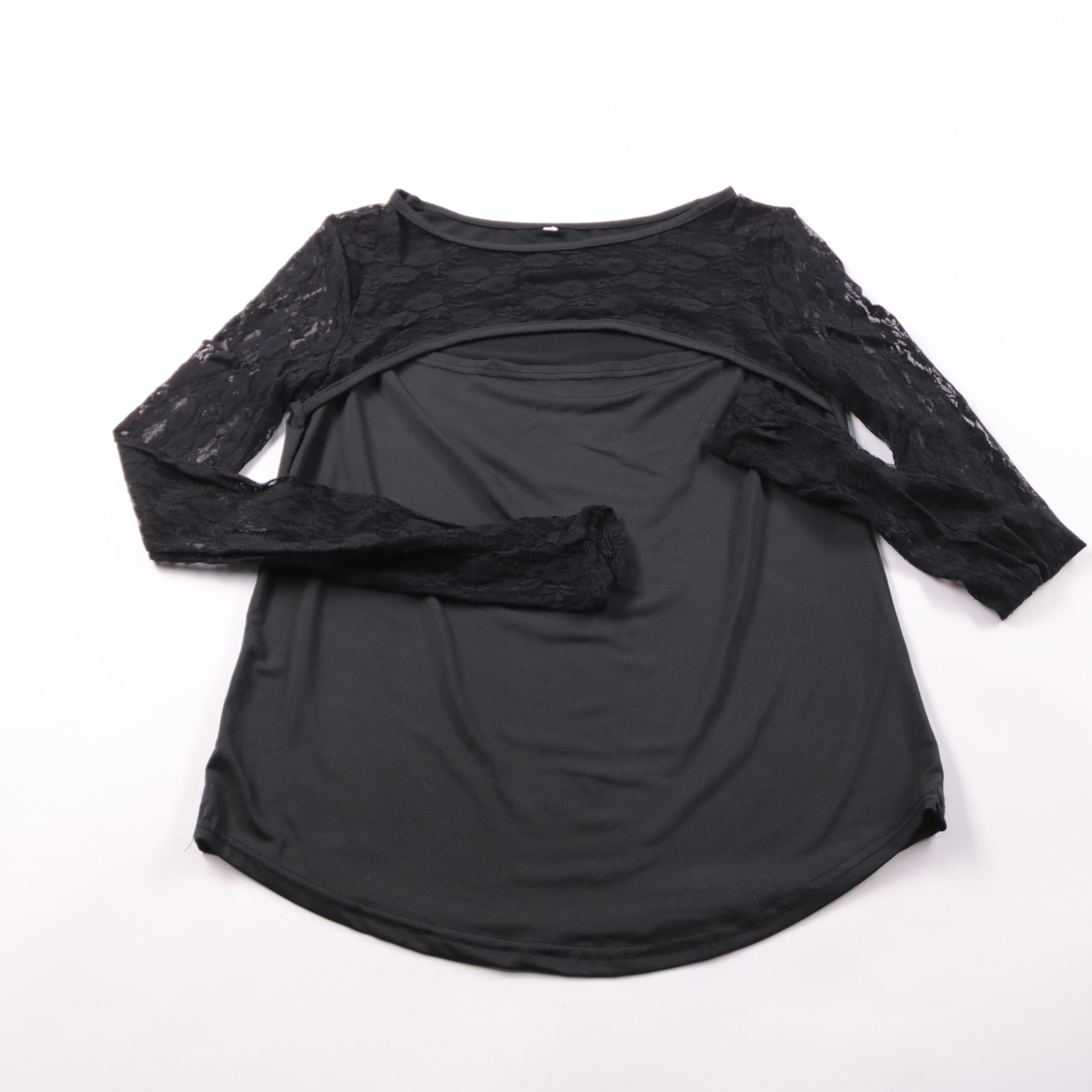 Женская чёрная блузка с кружевным верхом и длинными рукавами. Подойдёт для вечерних выходов и повседневных образов с джинсами или юбкой. Комфортно сидит и легко сочетается с базовыми вещами.