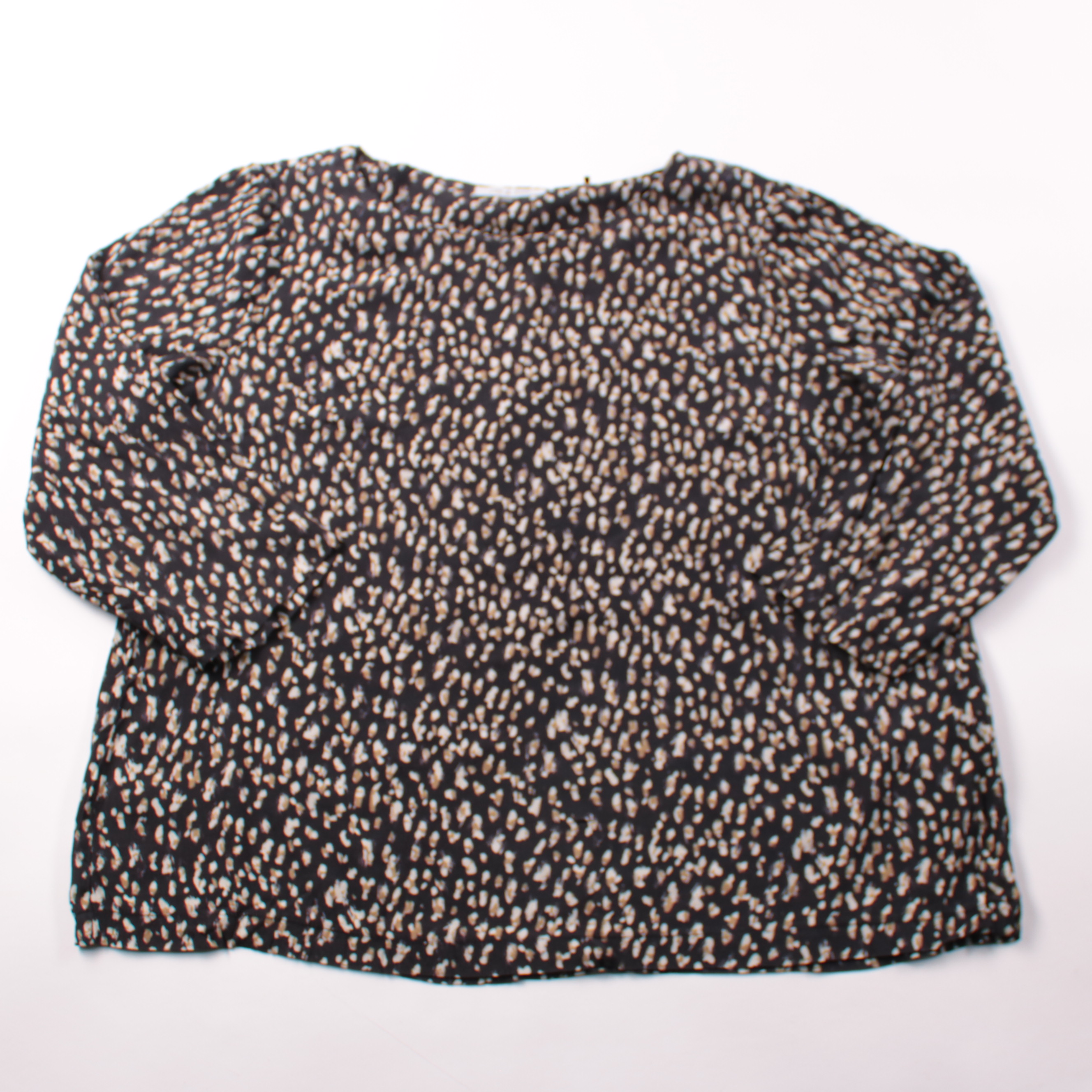 Блузка Cut & pret из 100% вискозы, чёрная с мелким бежевым принтом и коротким рукавом. Подойдёт для офиса и на каждый день, легко сочетается с джинсами или юбкой. Вискоза мягкая и дышащая, комфортна в течение дня.