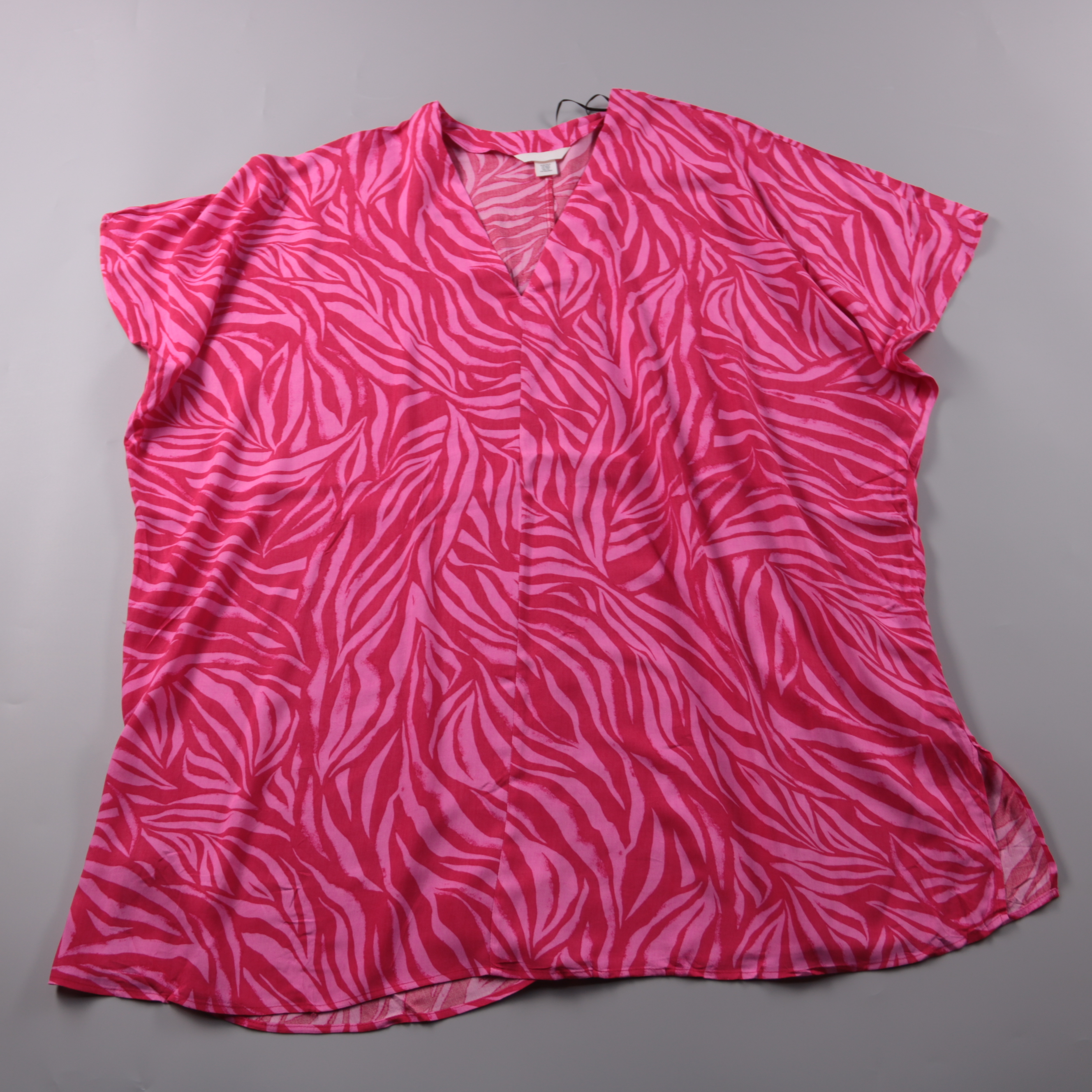 Блузка H&M из 100% вискозы с ярким розовым принтом и V-образным вырезом. Подойдёт для лета и отпуска, легко сочетается с шортами, джинсами и юбками. Ткань лёгкая и дышащая, удобно носить в жару.