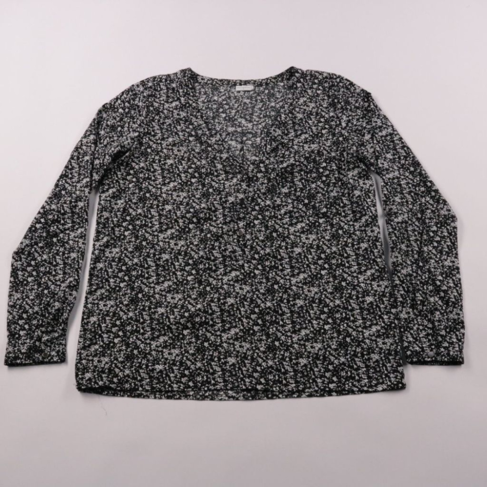 Женская блузка Jacqueline de Yong чёрного цвета с мелким белым принтом, длинный рукав и V-образный вырез. Подойдёт для офиса и на каждый день, легко сочетается с джинсами или юбкой. Практичный плюс — лёгкая ткань и простой уход.