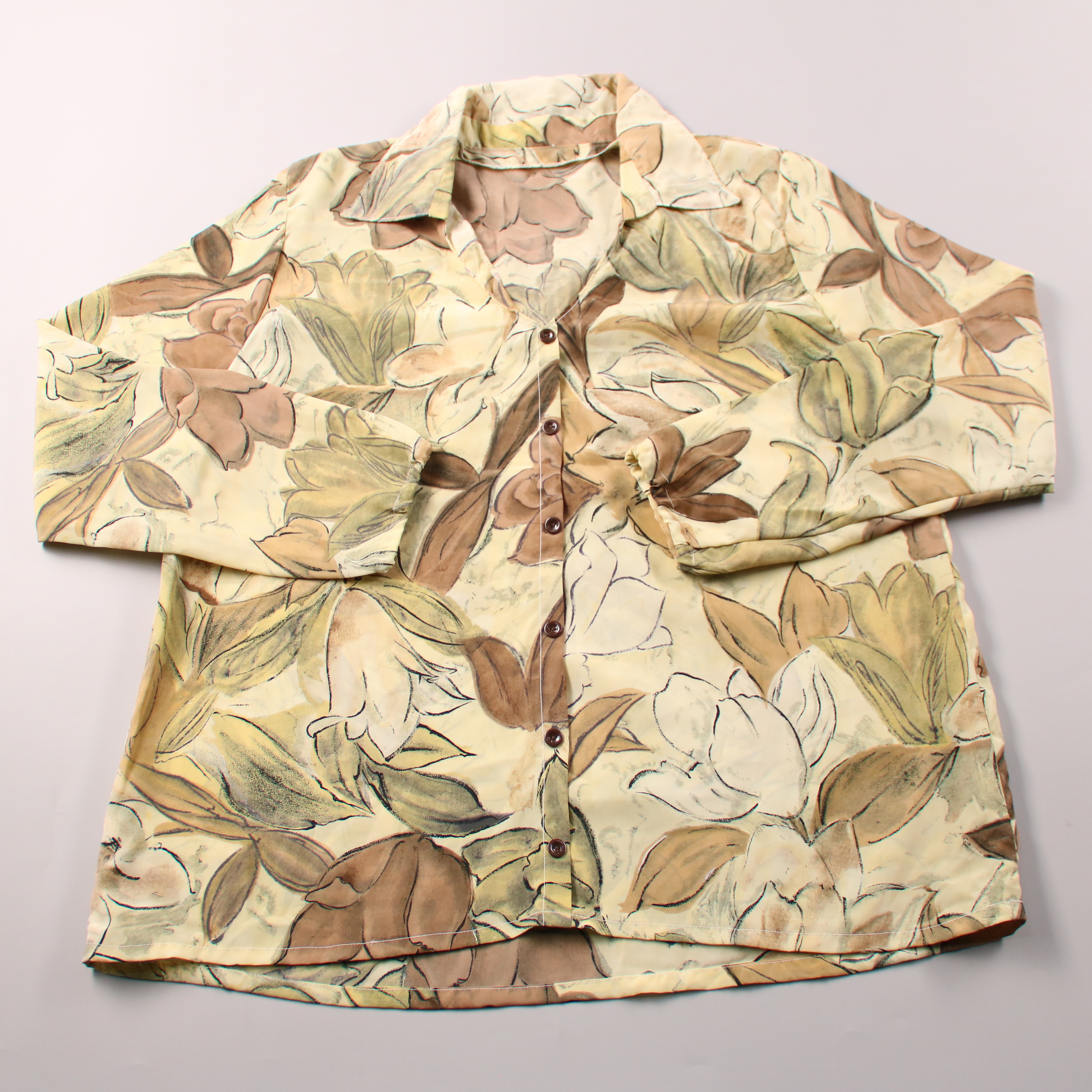 Женская блузка с цветочным принтом в бежево-зелёной гамме, с отложным воротником и застёжкой на пуговицы. Подойдёт для повседневных образов и офиса в тёплое время года, хорошо смотрится с джинсами или однотонными брюками. Лёгкая ткань и свободная посад...