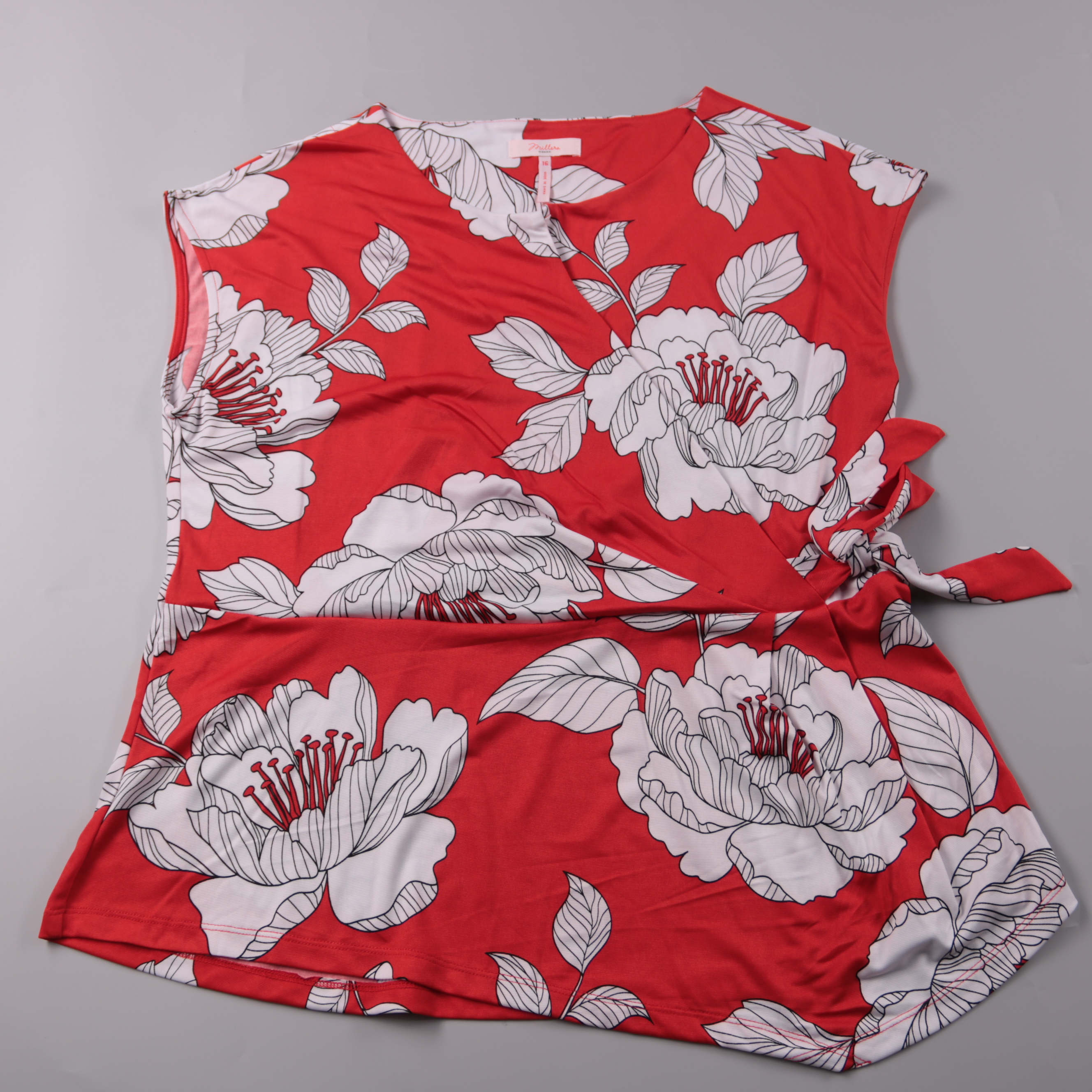 Женская блузка Millers с ярким красным цветочным принтом и запахом на завязках сбоку. Подойдёт для лета и тёплой погоды — носить с юбкой, шортами или брюками в casual-образах. Материал с эластаном слегка тянется и комфортно садится по фигуре.