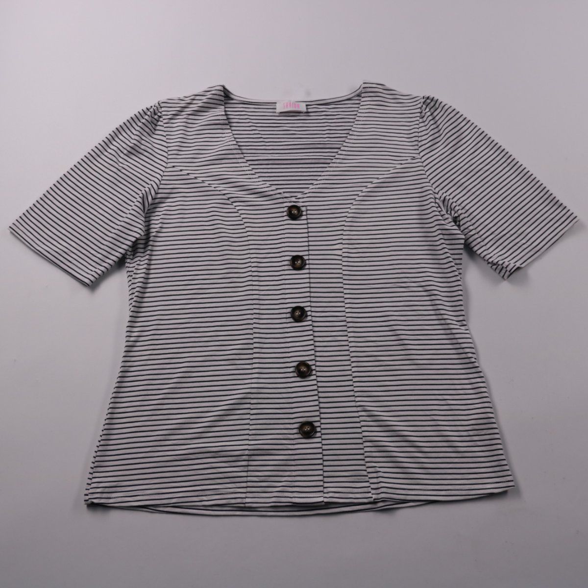 Блузка Savida в тонкую полоску navy/white с V‑вырезом и декоративными пуговицами спереди. Подойдёт для повседневных образов и офиса, хорошо сочетается с джинсами и юбками. Трикотаж с добавлением эластана слегка тянется и комфортно сидит.