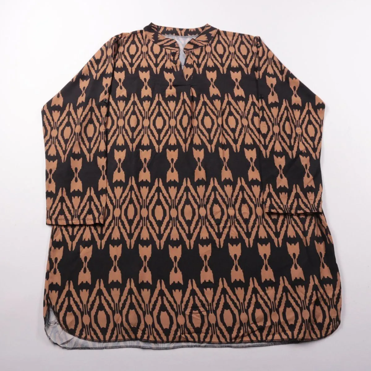 Блузка-туника с длинным рукавом и геометрическим принтом в чёрно-коричневых тонах. Подойдёт для повседневных образов и офиса, хорошо смотрится с джинсами или однотонными брюками. Лёгкая ткань и свободный крой не сковывают движения.