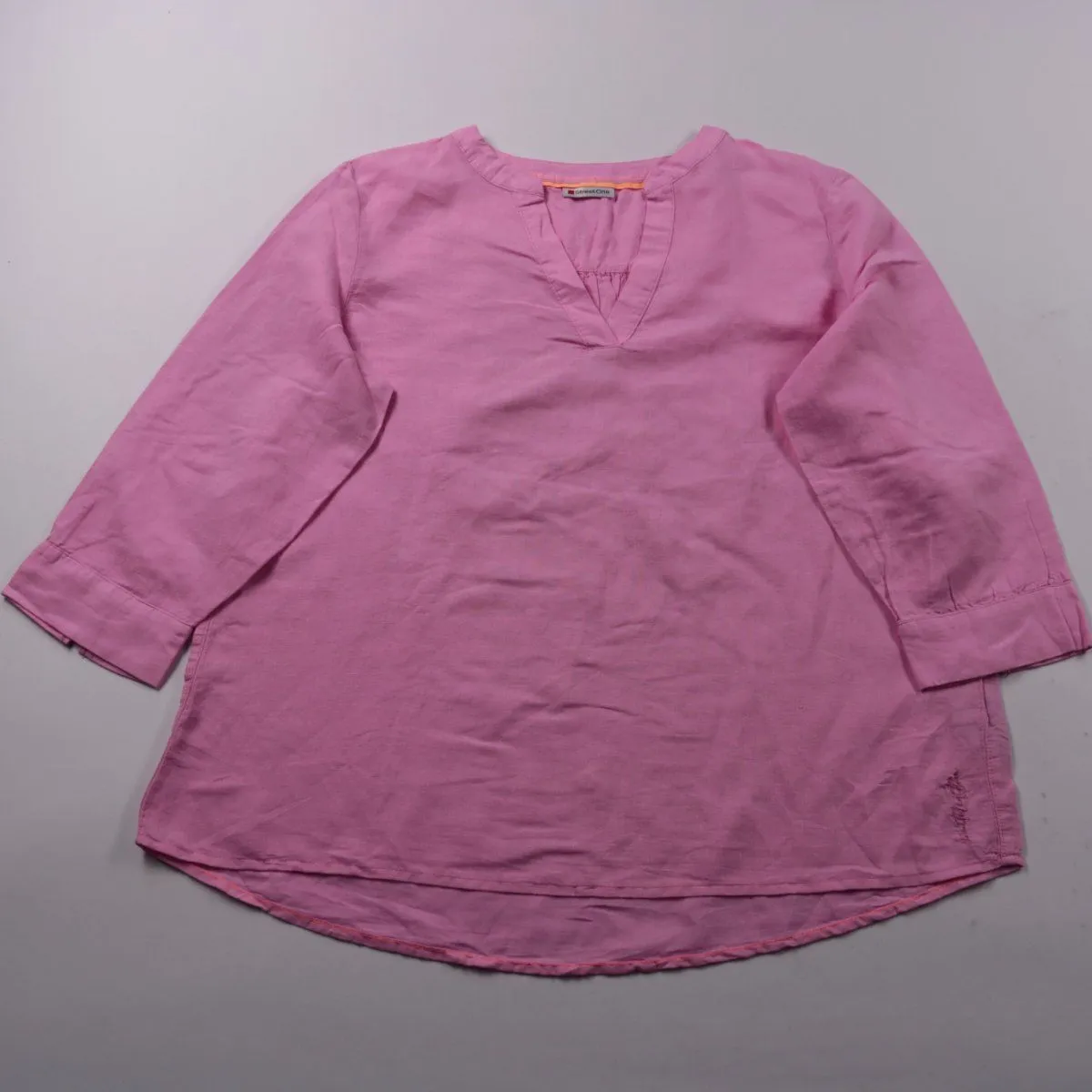 Льняная блузка Street One розового цвета с V‑образным вырезом и рукавом 3/4. Подойдёт для тёплой погоды и повседневных образов с джинсами или шортами. Ткань с льном хорошо дышит и комфортна в носке.