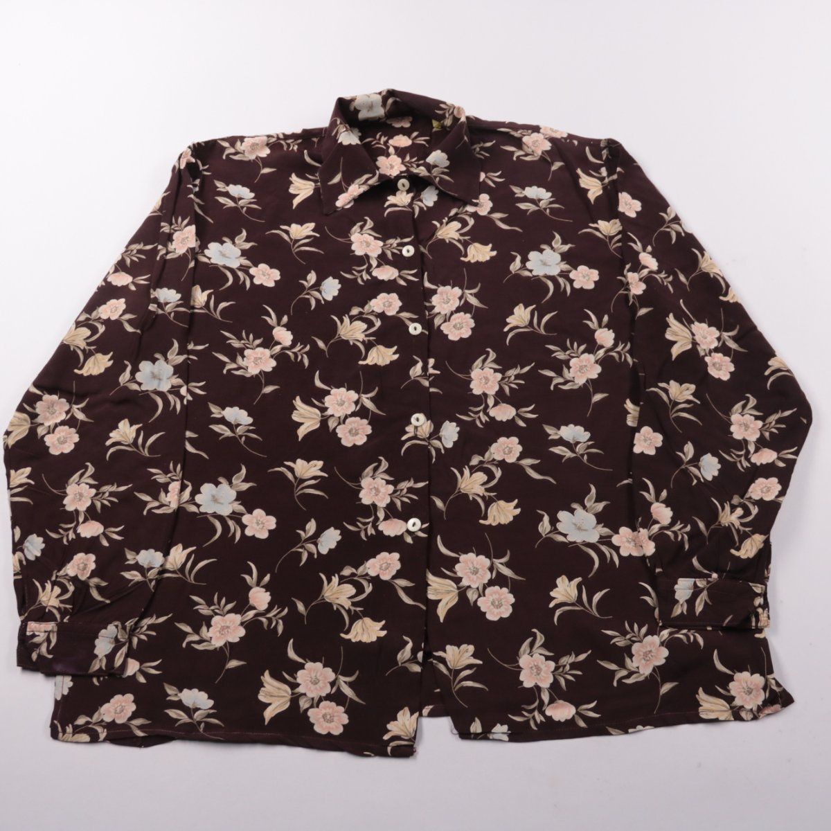 Женская блузка с цветочным принтом на пуговицах в тёмно-бордовом оттенке, с длинным рукавом и классическим воротником. Подойдёт для офиса и повседневных образов с брюками или юбкой. Лёгкая ткань почти не мнётся и удобно носится в течение дня.