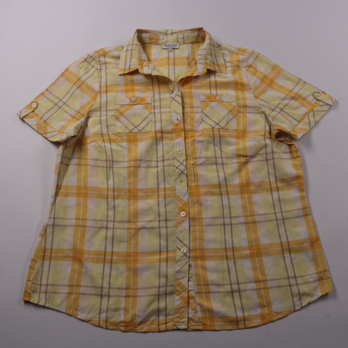 Женская рубашка Gina Laura в жёлтую клетку, короткий рукав, застёжка на пуговицы и два нагрудных кармана. Подойдёт для повседневных летних образов, прогулок и отдыха, хорошо смотрится с джинсами или шортами. Смесовая ткань со стрейчем приятна к телу и чуть тянется, поэтому удобно сидит.