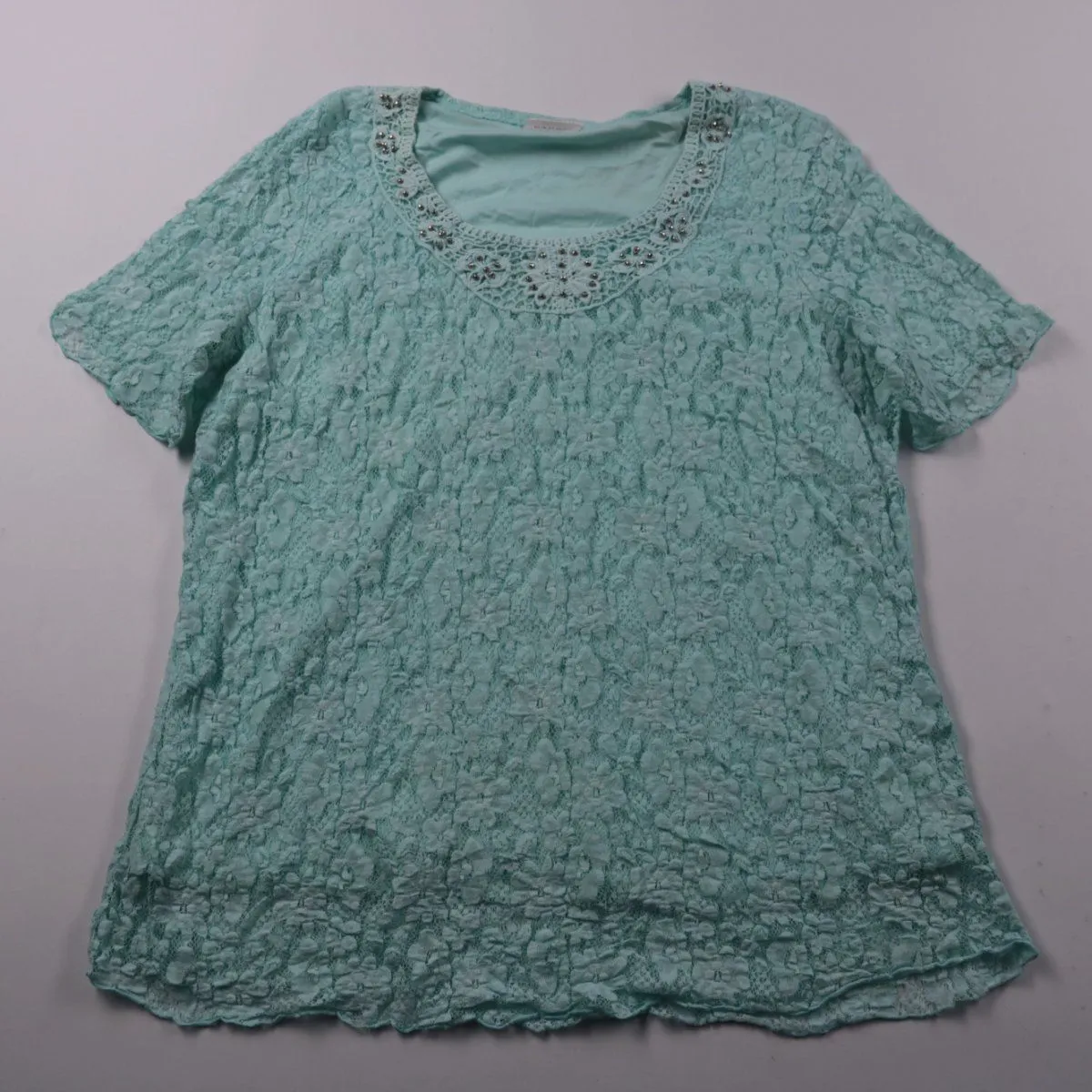 Женская блузка Canda мятного цвета с фактурной тканью и декоративной отделкой камнями по вырезу. Подойдёт для лета и тёплой погоды, хорошо смотрится с джинсами или однотонной юбкой. Материал с добавлением эластана тянется и комфортно садится по фигуре.