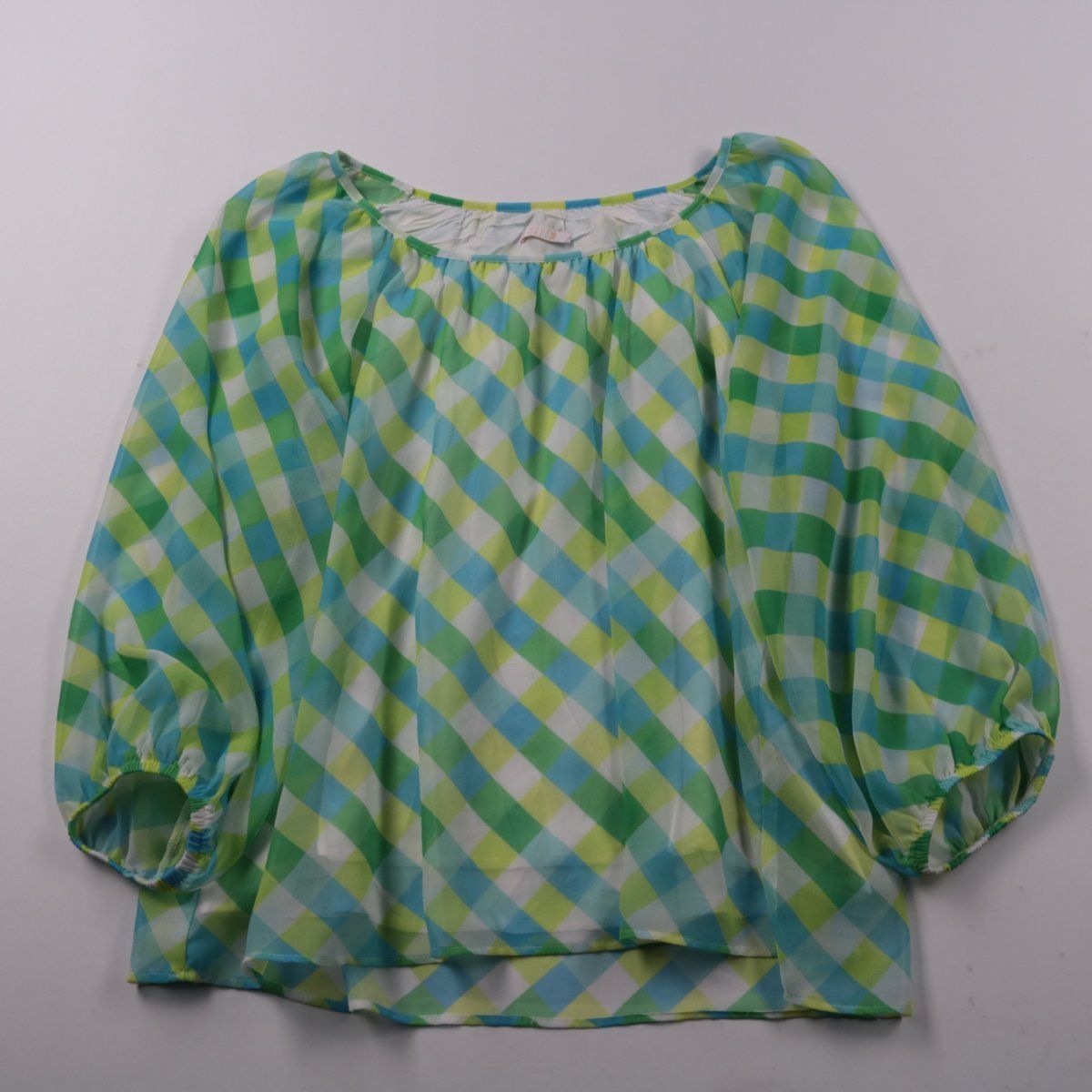 Женская блузка Sense в клетку зелёно-голубых оттенков, свободного кроя с эластичной горловиной и рукавом 3/4 на резинке. Подойдёт для повседневных летних образов и отдыха, хорошо сочетается с джинсами и шортами. Лёгкая вискоза приятно ощущается на коже и комфортна в жару.