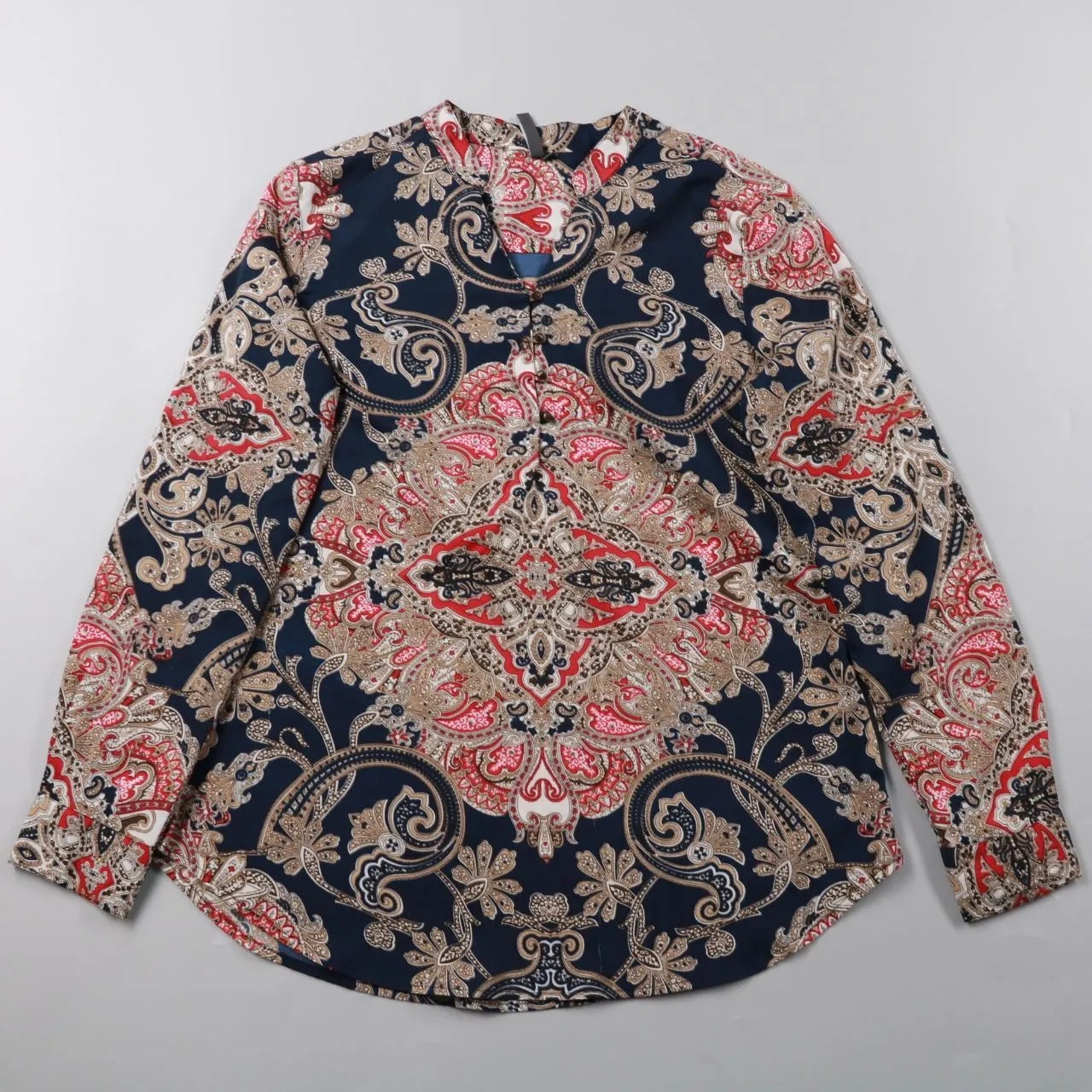 Блузка A.O.T с длинным рукавом и V-образным вырезом на пуговицах, выполнена в орнаментальном принте пейсли. Подойдёт для повседневных образов и в офис с однотонными брюками или юбкой. Практичный плюс — лёгкая ткань и выразительный рисунок, который не т...