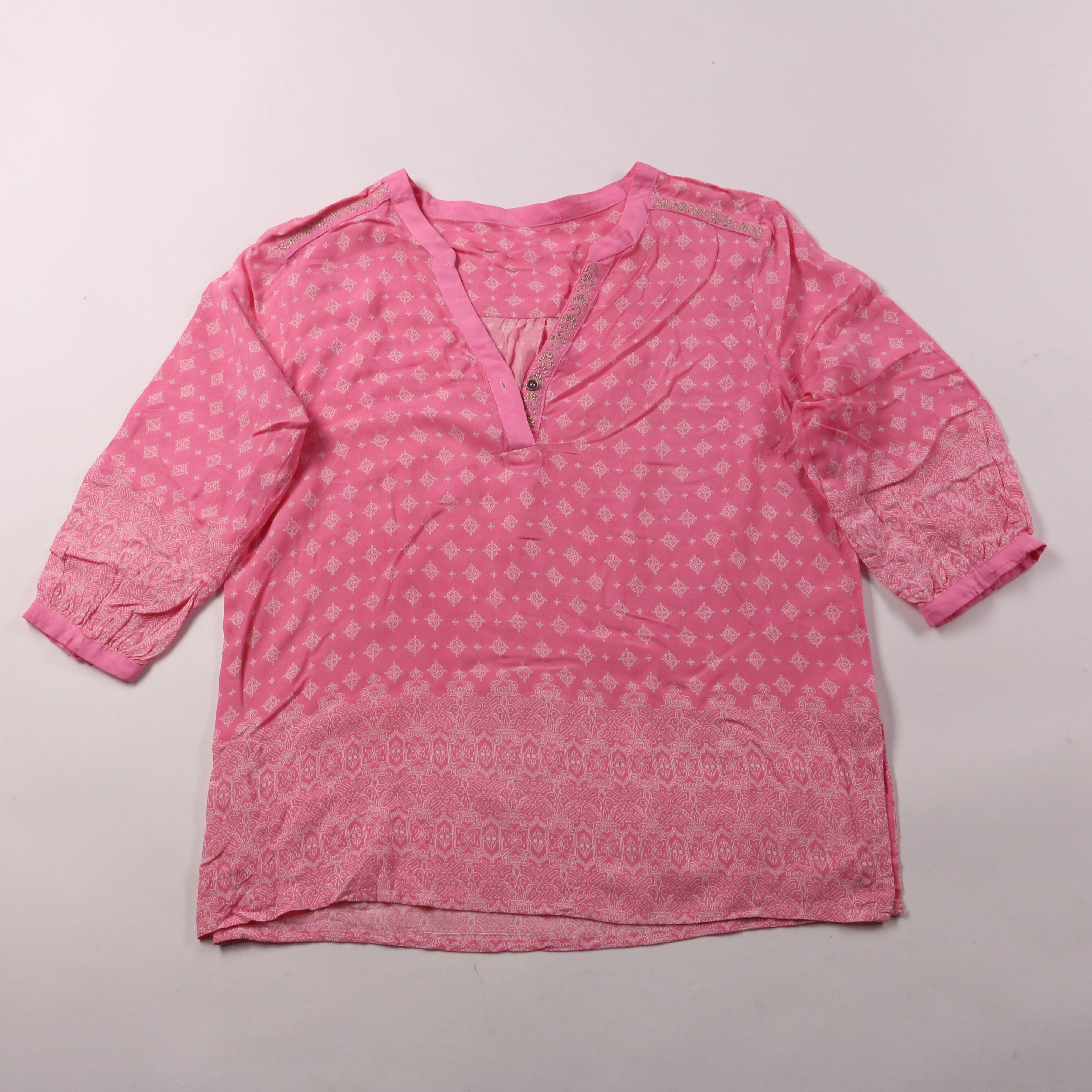 Розовая женская блузка с белым орнаментальным принтом и V-образным вырезом с планкой. Подойдёт для летних прогулок и повседневных образов, можно носить навыпуск. Свободный прямой крой не стесняет движений и легко сочетается с джинсами и брюками.