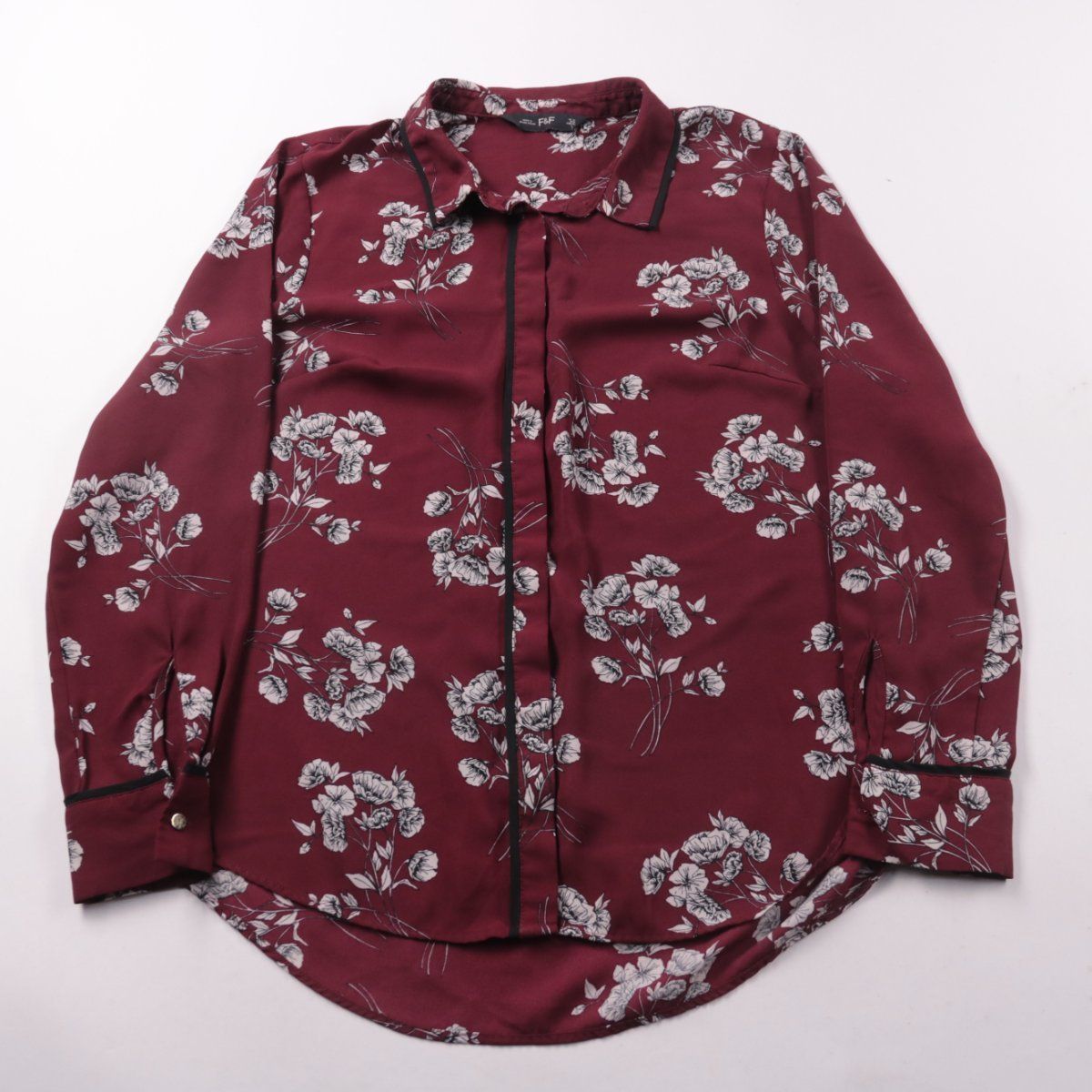 Женская блузка F&F бордового цвета с белым цветочным принтом и контрастной окантовкой по планке и манжетам. Подойдёт для повседневных и офисных образов в сочетании с джинсами или брюками. Практичный плюс — полиэстер легко стирается и почти не мнётся.