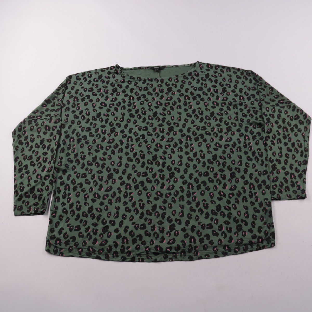 Женская блузка Next из вискозы с добавлением эластана, зелёная с леопардовым принтом и длинным рукавом. Подойдёт для повседневных образов и офиса без строгого дресс-кода. Ткань слегка тянется и комфортна в носке.